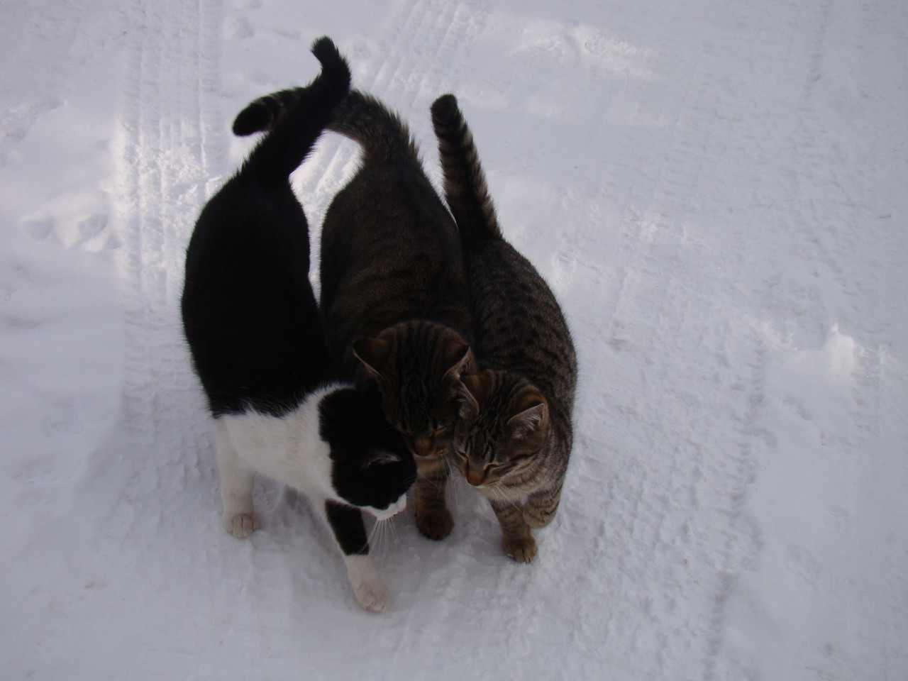 雪道を何を話て歩いてるのかな? ほほ笑ましい野良ちゃん達です。