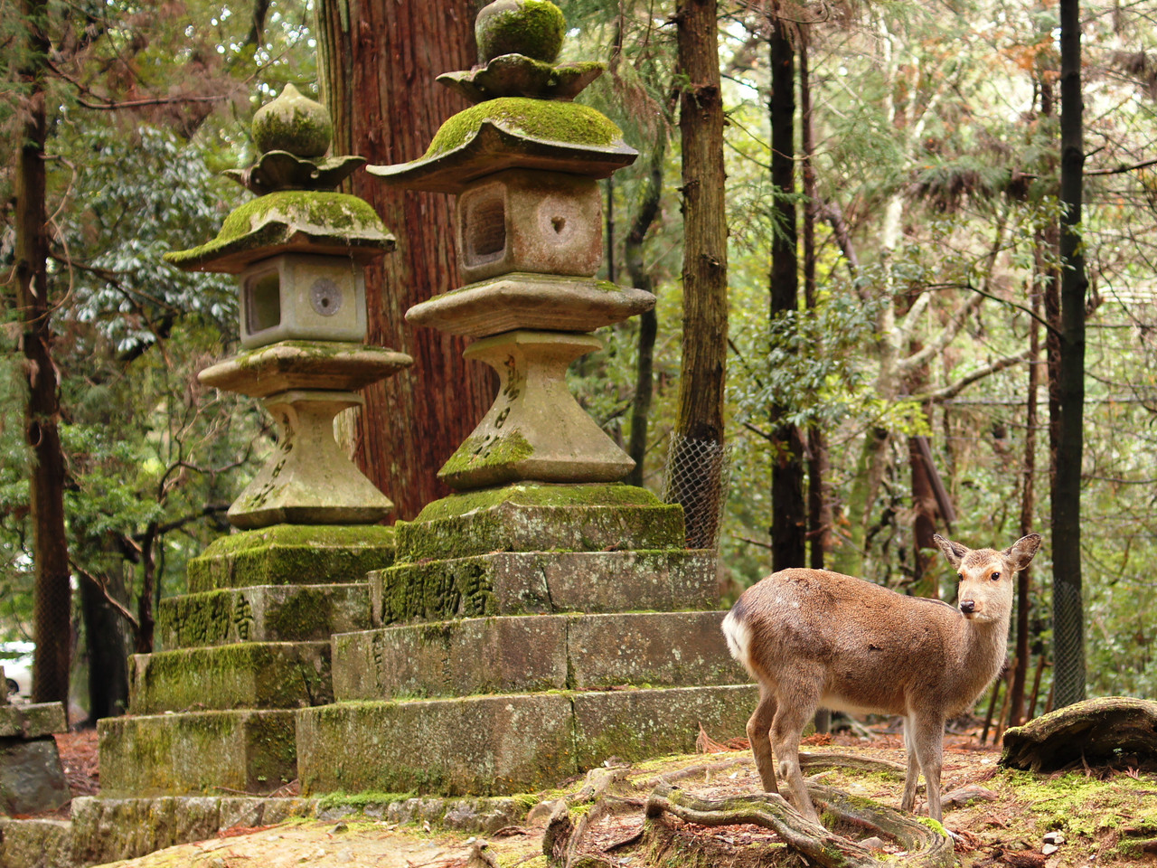 春日大社の森の中、一頭のシカに出会いました。