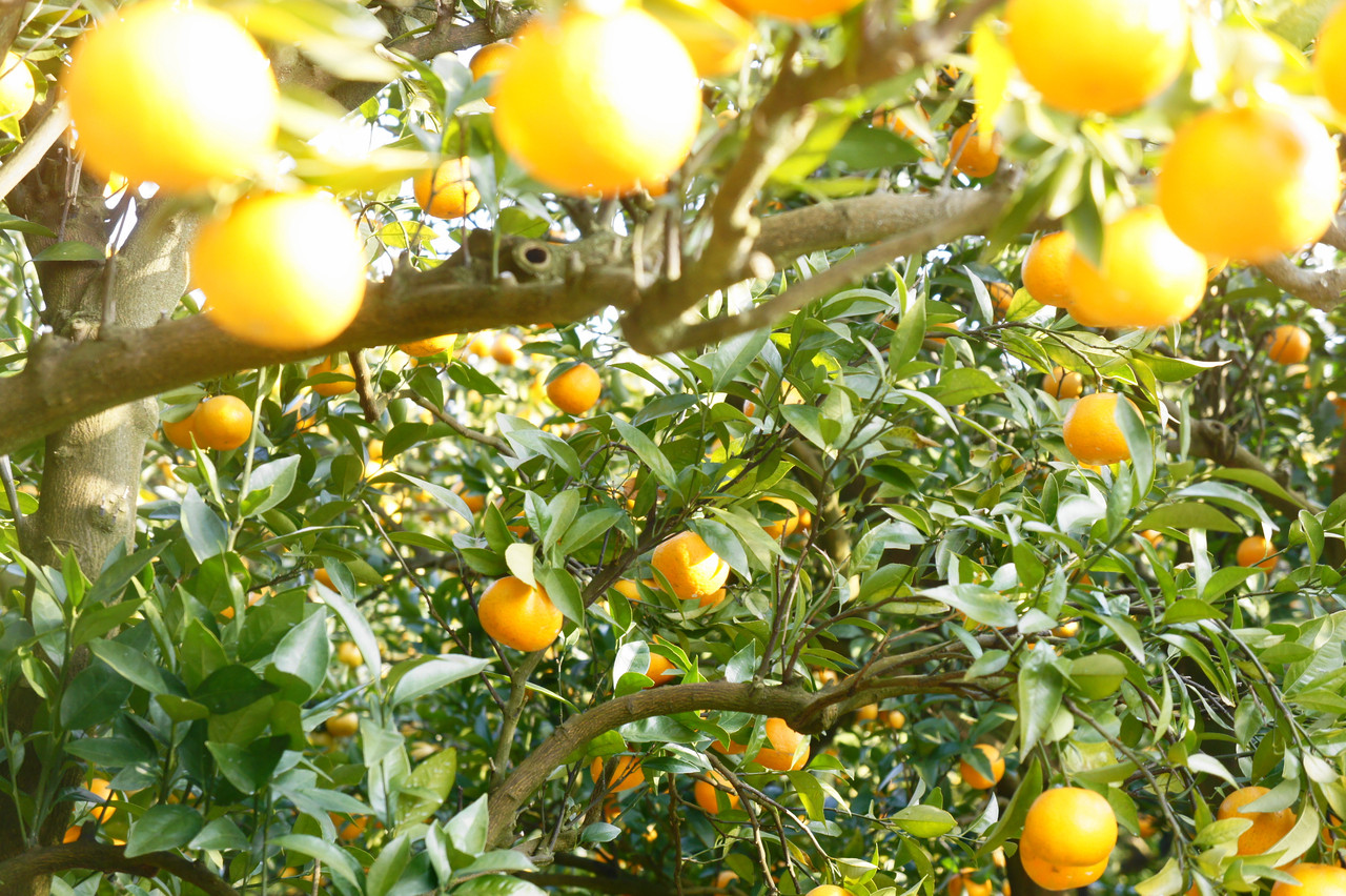 早朝の朝日を浴び収穫前のポンカン?たち。二日酔いの朝に柑橘系のイオンが心地いい。