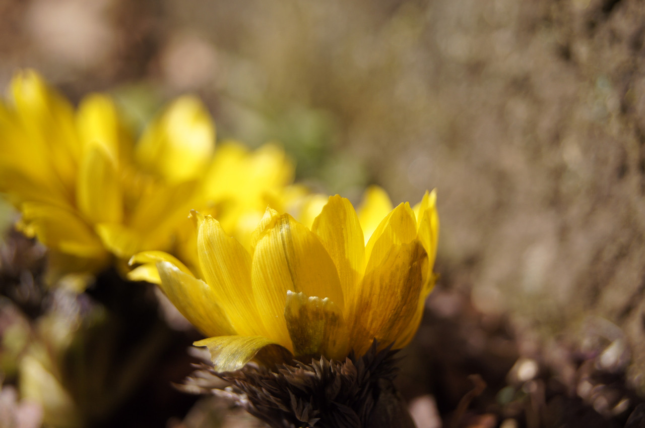 福寿草がたくさん咲く公園に行ったのですが、 今年は寒さが厳しくちらほらしか咲いていませんでした。