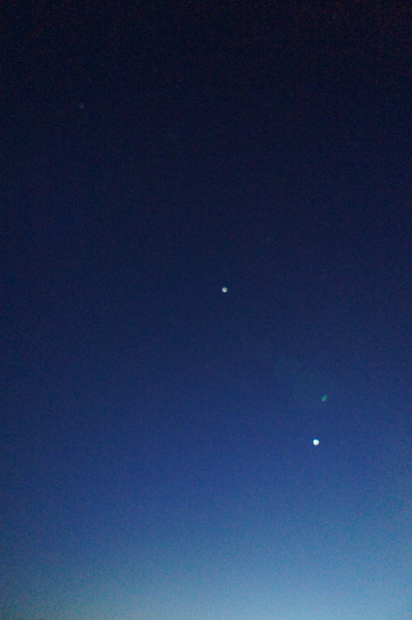 上が木星で 下が金星 のはず。 山の吹雪に比べ しずかな下界と澄んだ空。 週末にはふさわしい夕暮れ。
