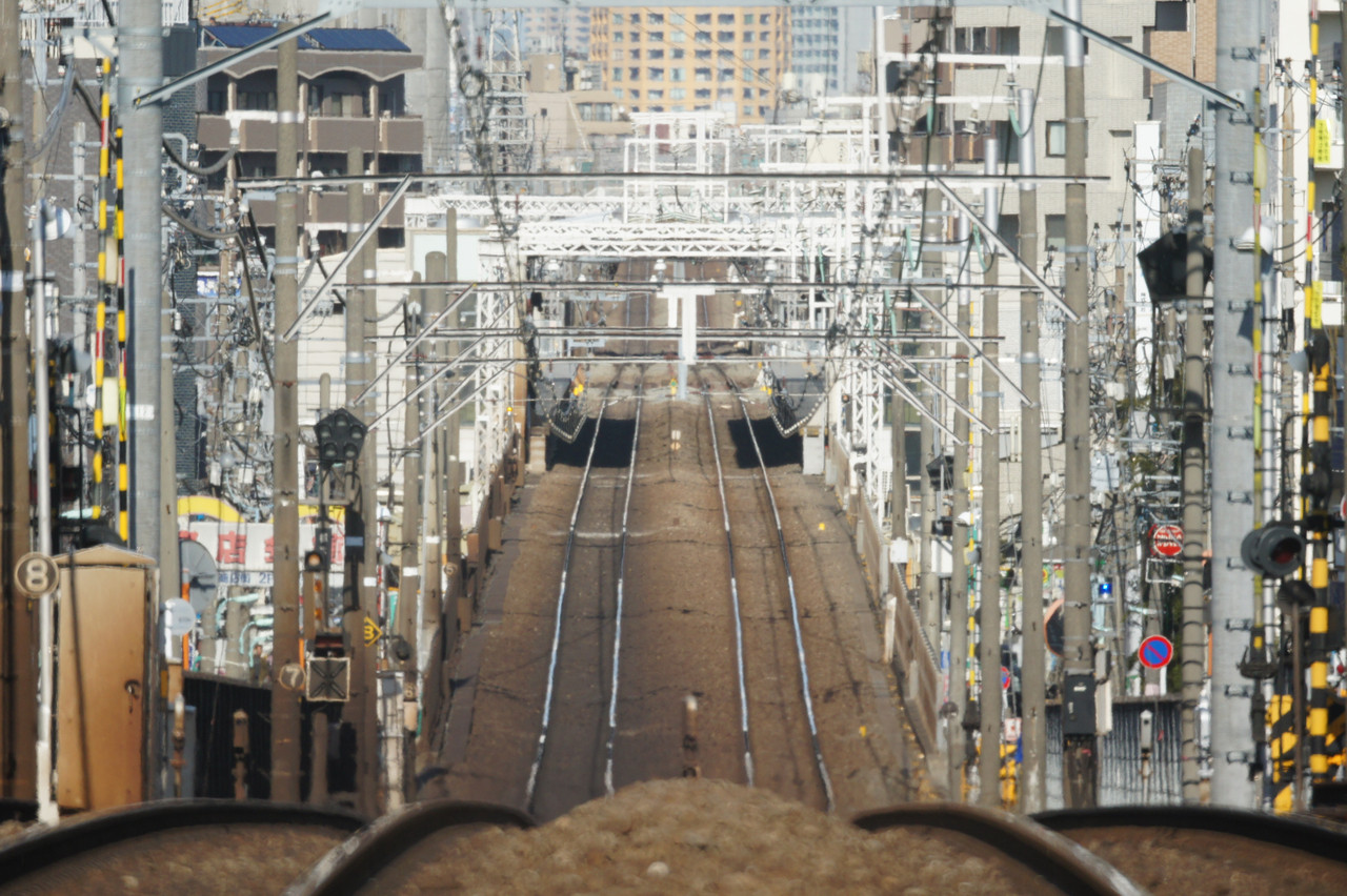 余りに画角が狭くて暗いため半分諦めかけましたが、丁度差し掛かった踏切で線路が長く伸びている事に気付いてちょっと面白い感じに撮れました。
