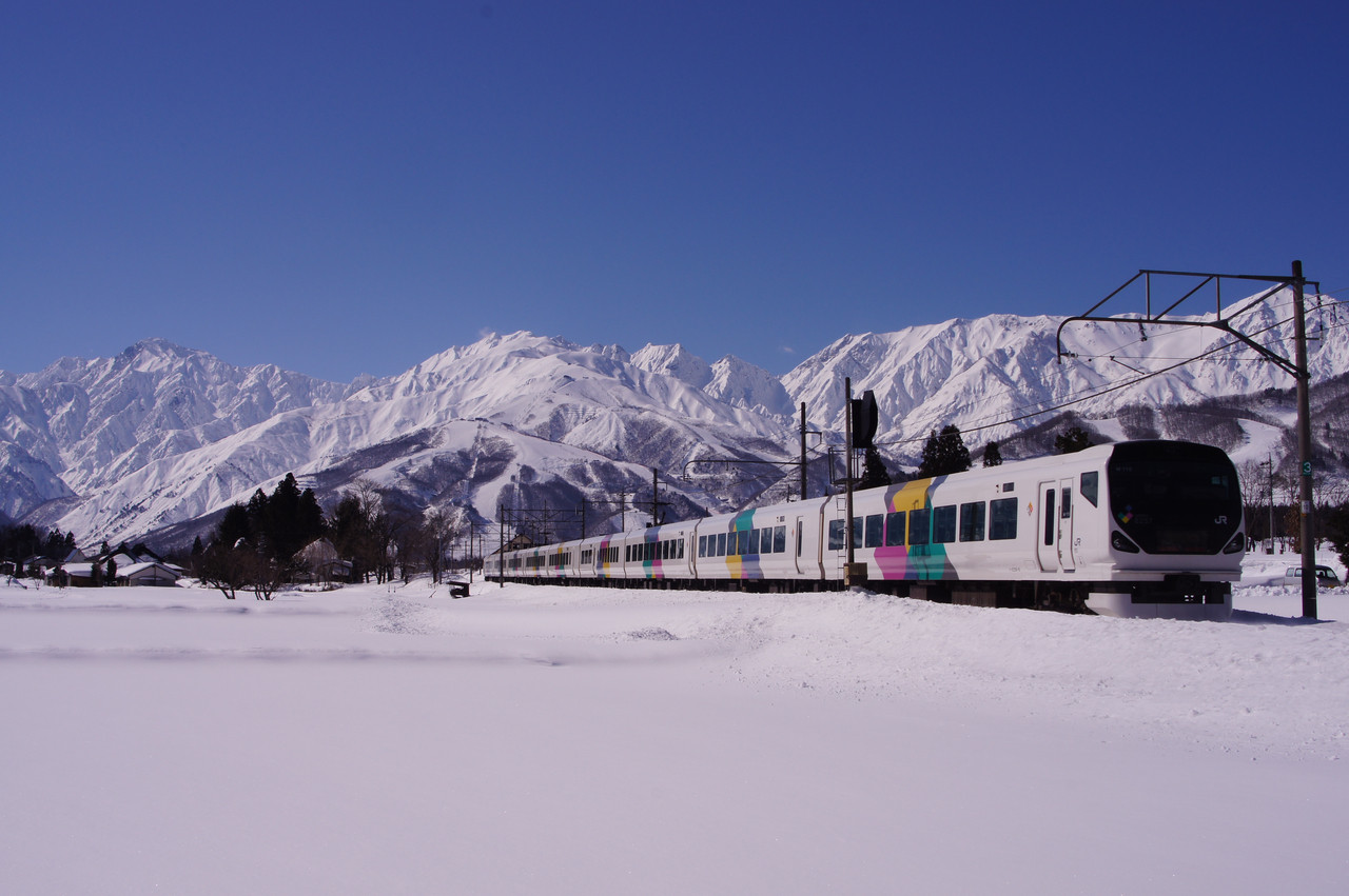 白馬行き上り回送列車です。 背景は北アルプス八方尾根スキー場 目が覚めるような景色でした。
