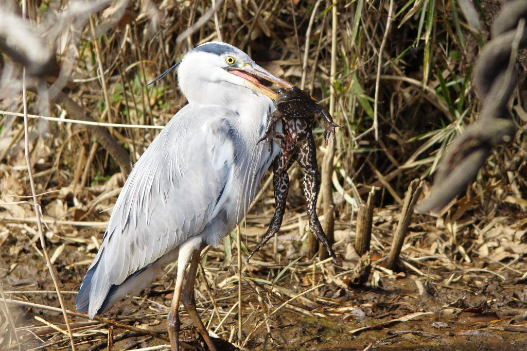 大きなウシガエルがアオサギに捕まってしまいました。 冬眠から覚めて出てきたところを捕まったか、冬眠中を襲われたか分かりませんが、このあと、かなり苦労をして呑み込まれてしまいました(^_^;)