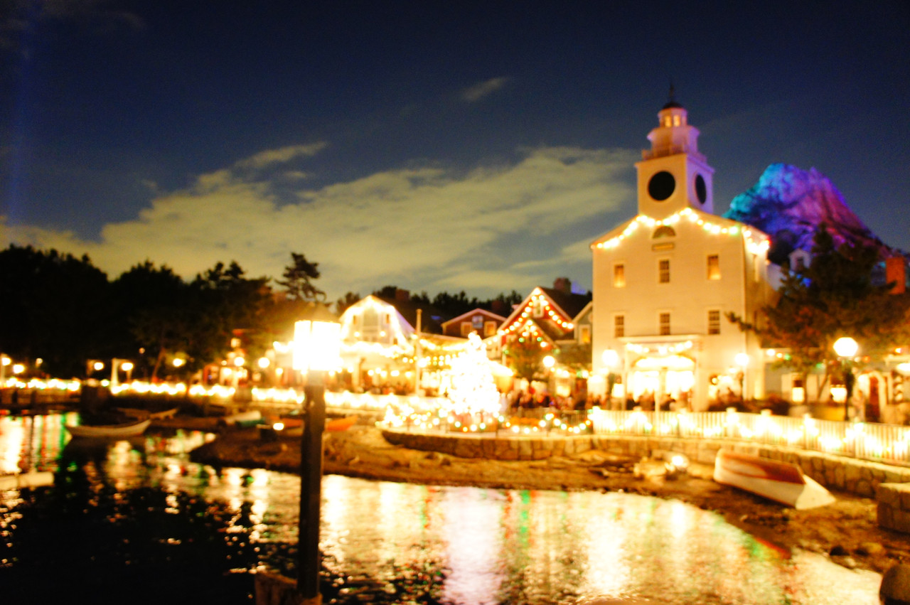 夜のディズニーシー。ライトアップされていて綺麗。