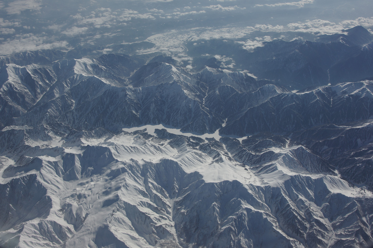中央のくぼみの白い部分が黒部湖、拡大していただくと小さく、小さくですが、左端にアーチ型の黒部ダムが見えます。湖の手前の真っ白な山は立山連峰、湖の向こう側が後立山連峰(やまやさんのコメントより一部抜粋)