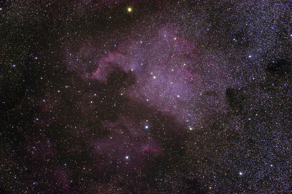 この写真は、白鳥座の近くに広がる通称「北アメリカ星雲」です。この写真を左90度回転すれば、なんとなくイメージできるかな?