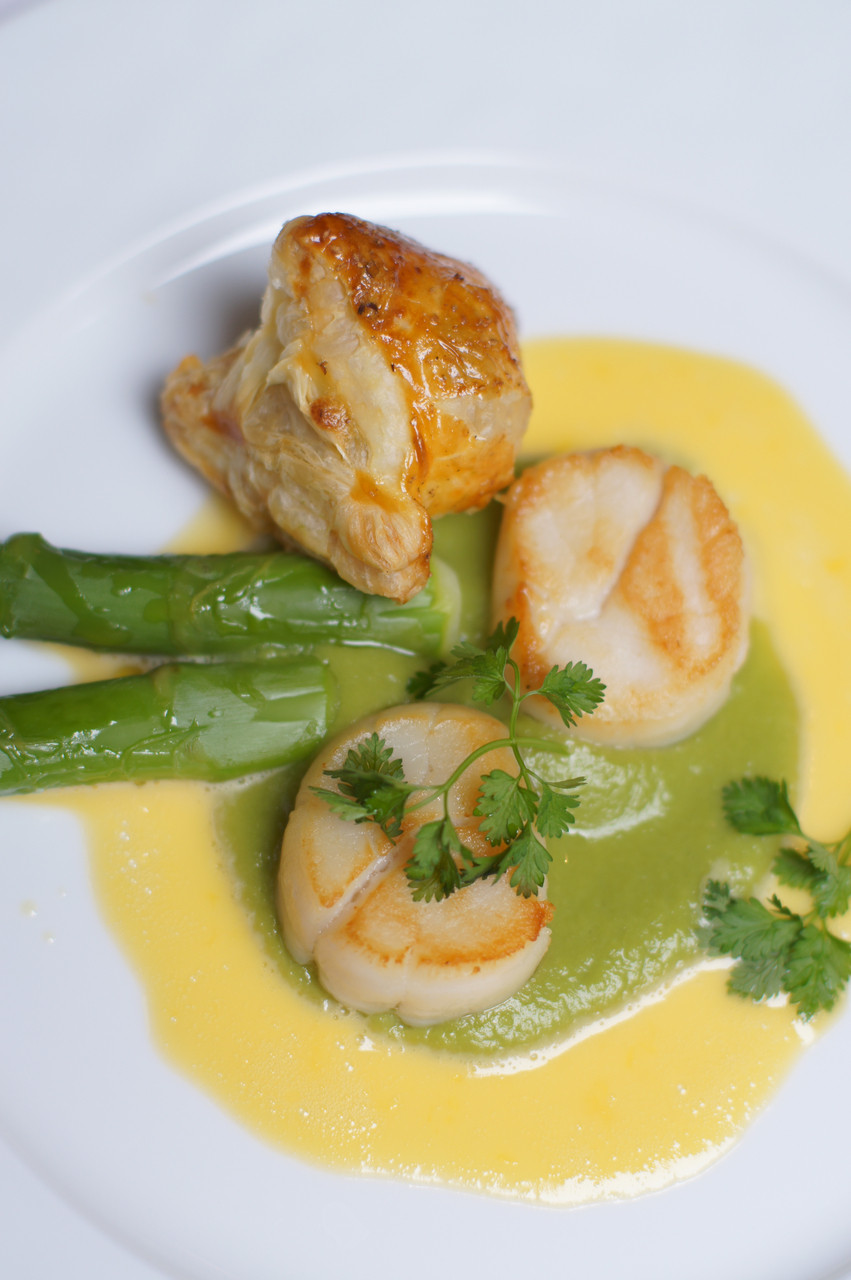 ホタテ貝のポワレ オレンジ風味のバターソース アスパラガスのエチュベ添え 付け合わせのパイの中身は、黒オリーブでした。 『メゾン ポール・ボキューズ代官山』にて