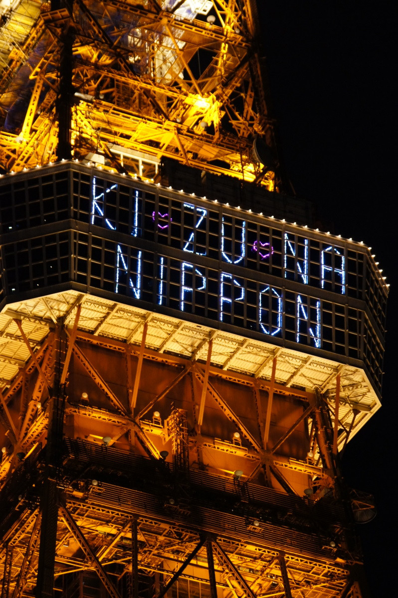 簡単に絆とか 言えないけど・・・・。 あれから1年立ちました。 いろんな思いを胸にしならが、東京タワーに表示された KIZUNA NIPONを見ました・・・