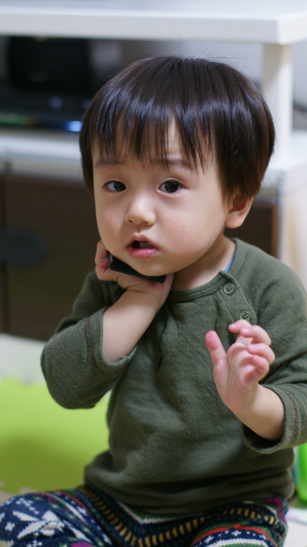 親の仕草を見よう見まねでやっています。 何か聞こえてるのかな? とりあえず携帯返してください。