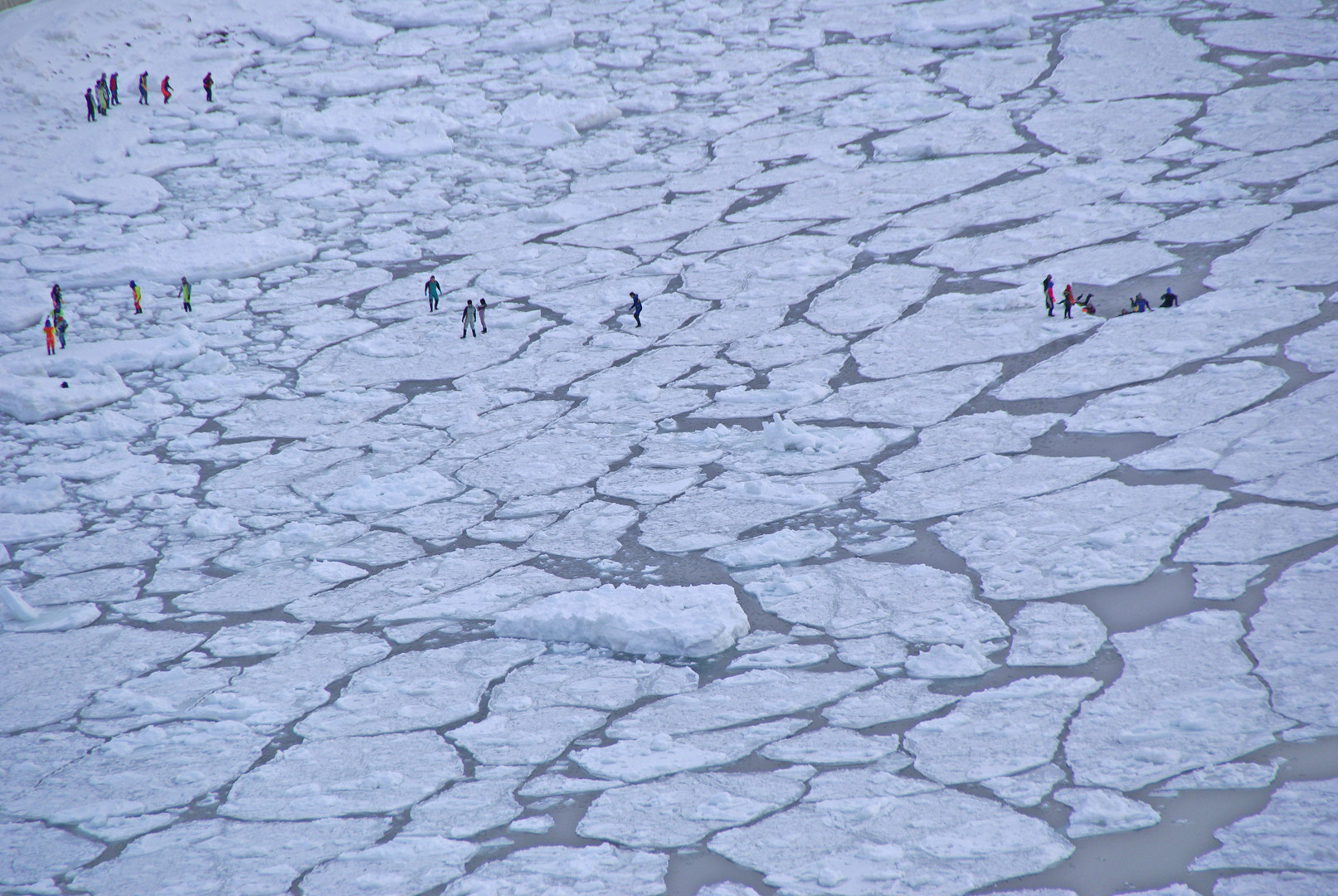 流氷ウォーク中の人びと。 昔見かけたシミュレーションゲームの画面を連想してしまいました(笑)。