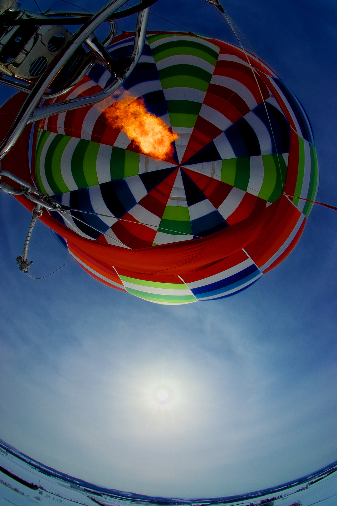 上士幌町上空、高度374.52mにて ゴンドラの縁に腰をあててエビ反って撮ってるんですが、熱気球も二回目になると、へっちゃらぴーになってきました。(^^♪ 今日のパイロットは高校生の男の子ですよ。訓練飛行なんですが、勿論ライセンスをもったお父さんも同乗しています。(*^^)v