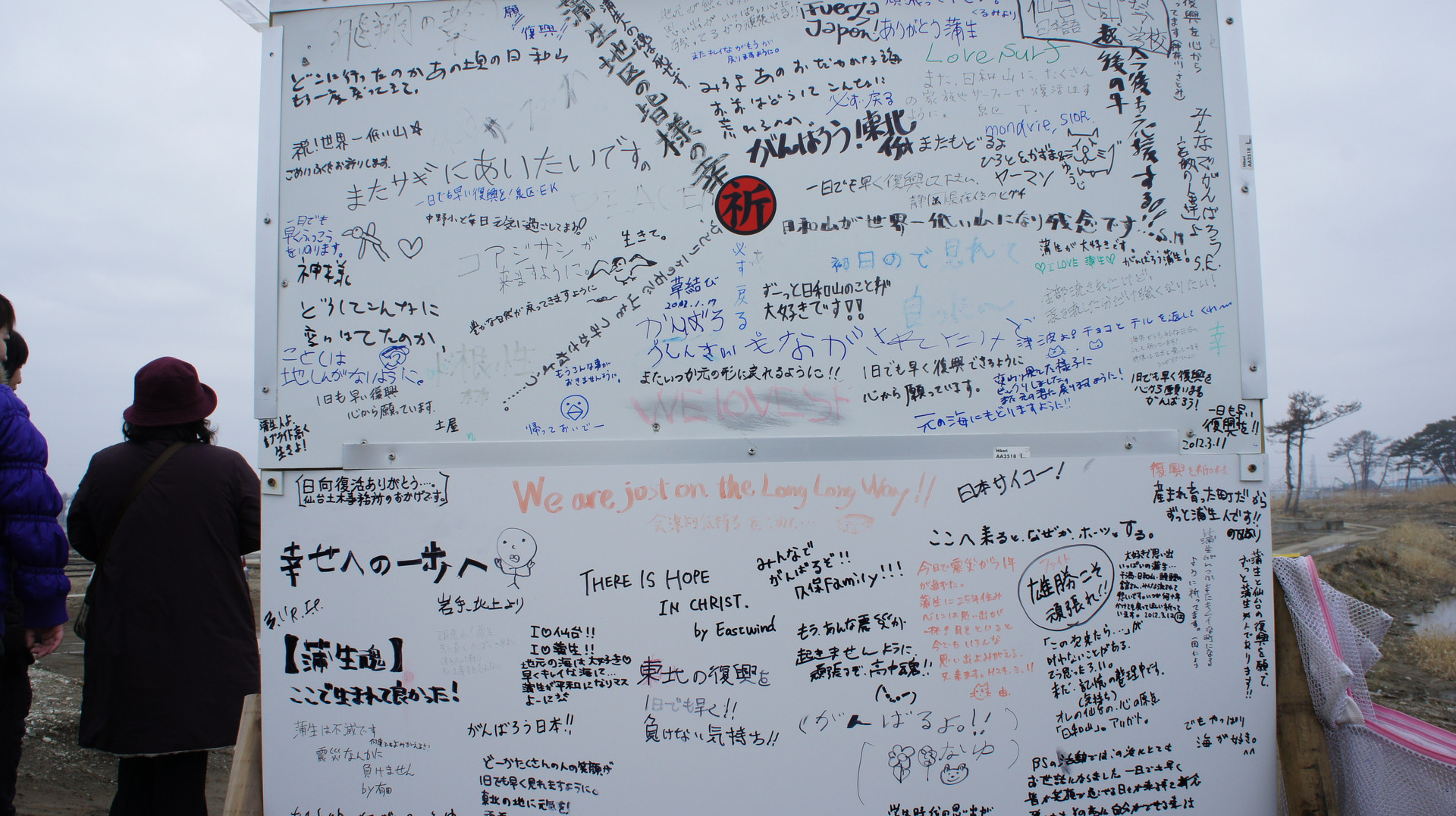 その跡地には「日和山」の標識があり、その標識の裏にはいろんな人からの