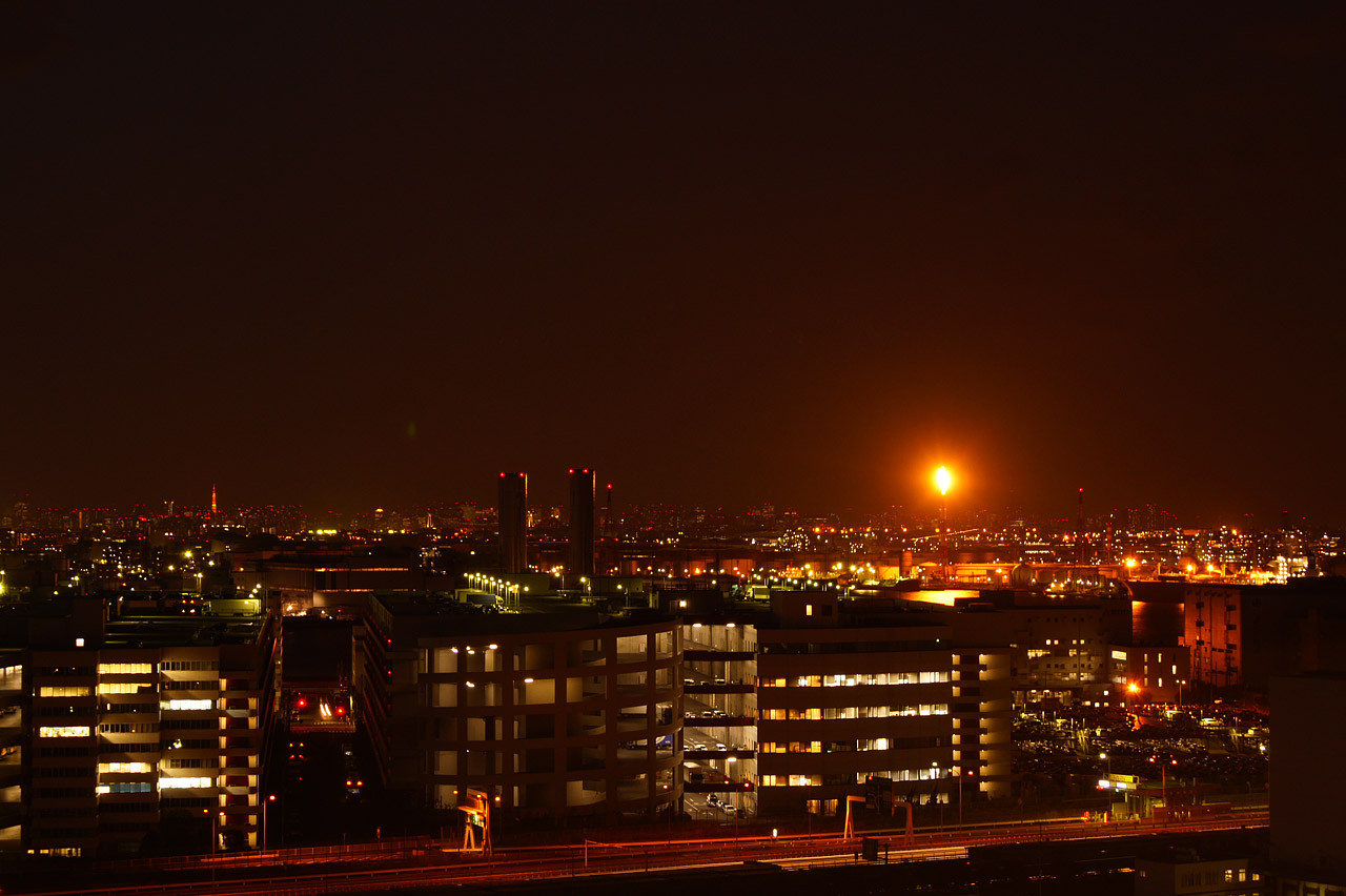 川崎マリエンの10Fにある展望室から。 火の玉のように見えるのは、どこかの煙突から勢いよく吹いていた炎です。 火力発電所の炎でしょうか? 炎が付いた瞬間、結構な広範囲が明るくなってました。 これも望遠レンズ持参して、再挑戦したいです。