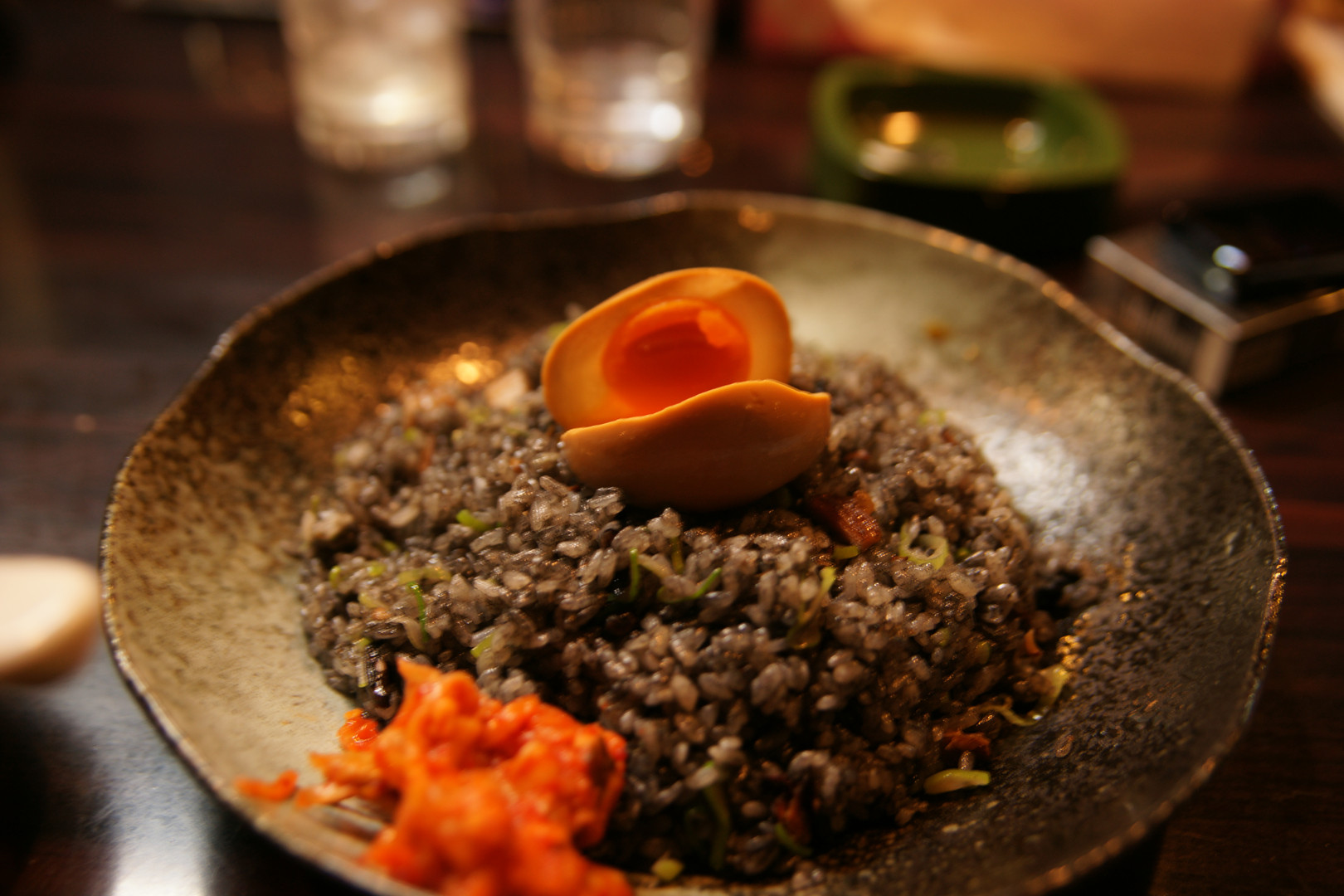 いつも行く常連のラーメン屋で出しているブラックチャーハン 沖縄から取り寄せたイカスミを使っているそうです。激ウマ! そしてお酒が入っているせいでまたブレにぶれている