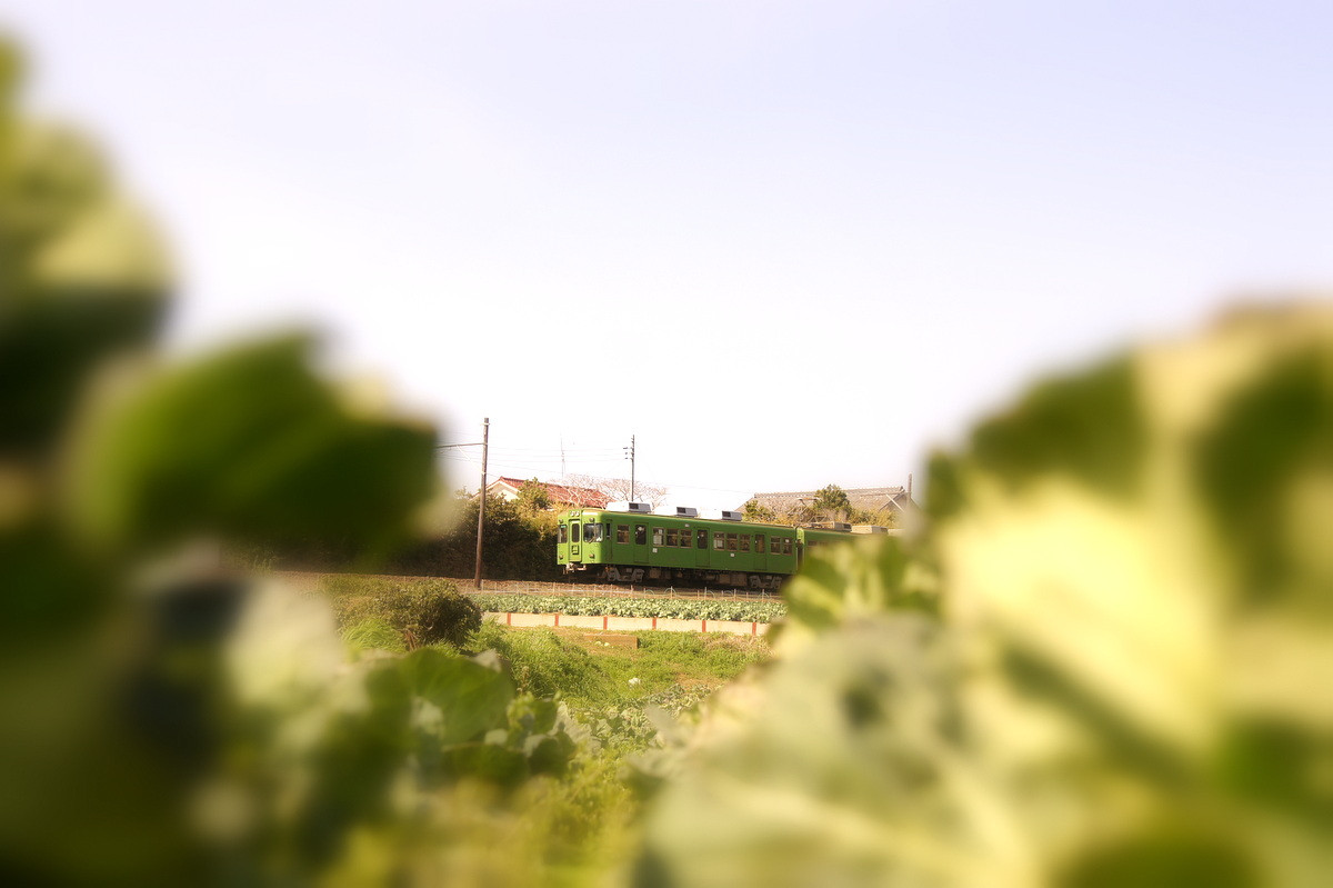 キャベツ畑から銚子電鉄のグリーンの電車を・・・・。 やわらかい春の訪れを感じていただければ、嬉しいです。