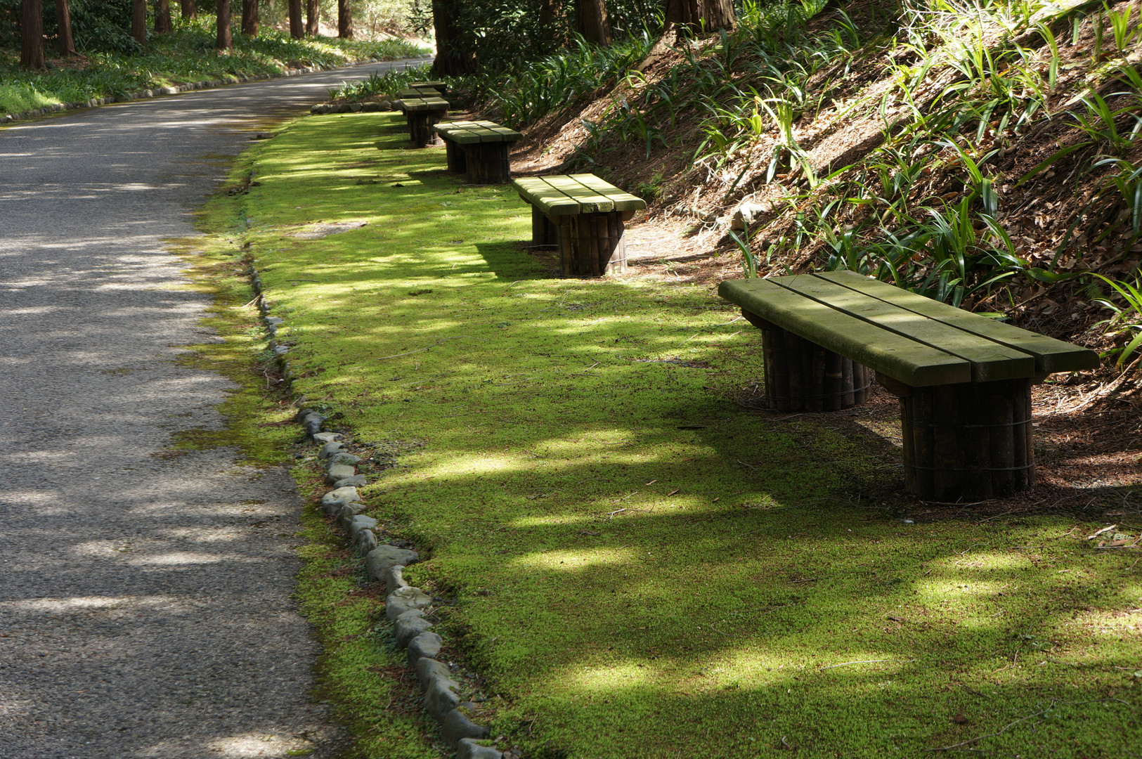 この、、緑色のベンチと斜面と光具合がとても良い感じ。 大阪万博記念公園内の日本庭園でした。