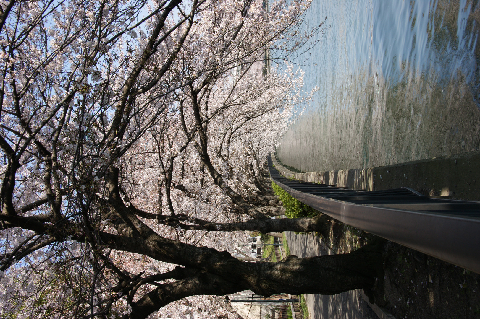 川面に向かって桜が咲いてトンネルになっています。道路側もトンネルなんだけど、川の上は散りだしてもきれいですよ。