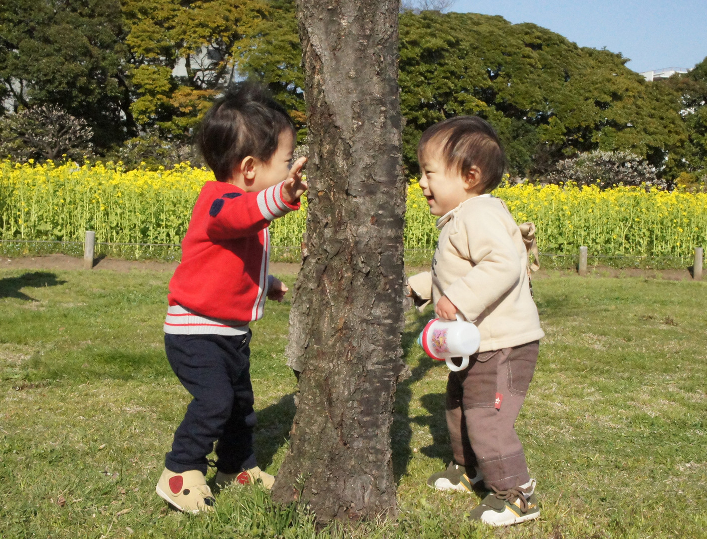 1歳4ヶ月になる二人が1本の木をはさんでいないいないばぁ遊び。 とても楽しそうにしている姿に大人たちは癒されました。 この月齢ならではの可愛らしさがたまりません