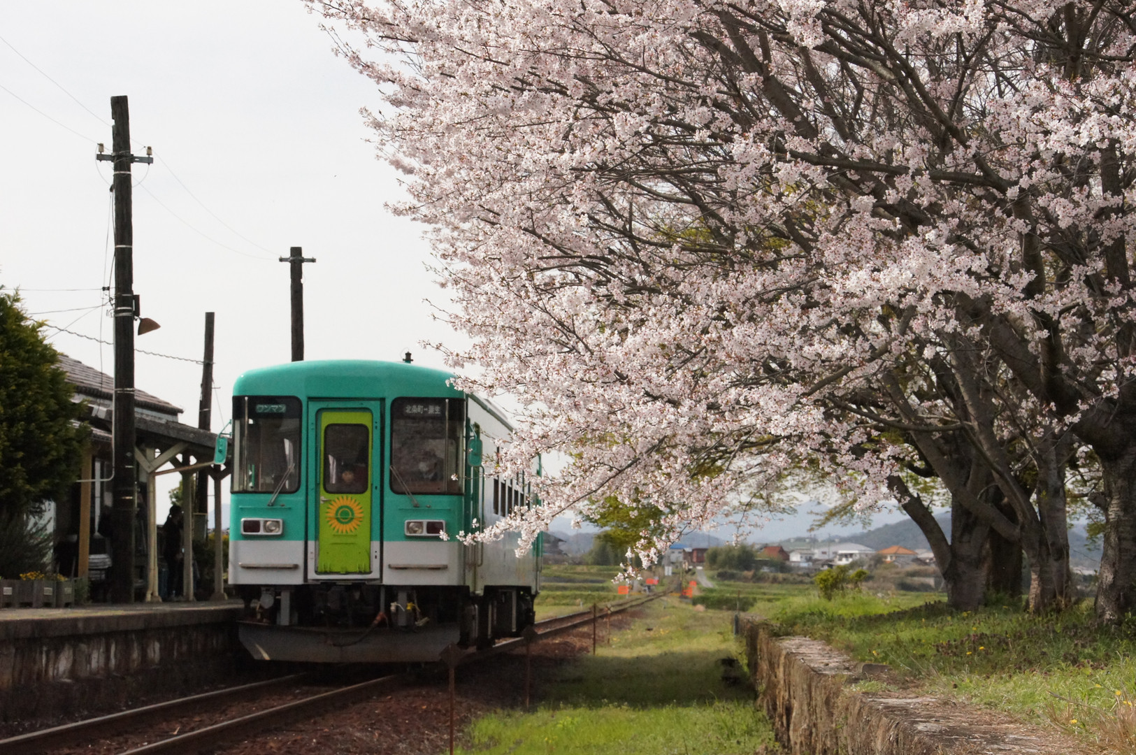 兵庫県加西市を走るローカル鉄道(北条鉄道)の法華口駅の画像です。のんびりと田園風景を背景に走る列車とレトロな駅舎が印象的でした。