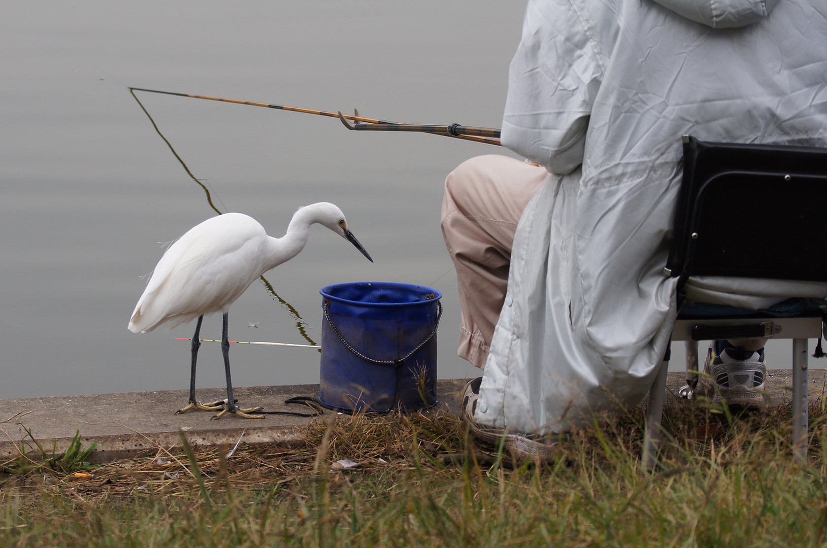 なんか釣れたのちょうだい〜 って感じで、釣り人の周りをうろうろしてるコサギです。