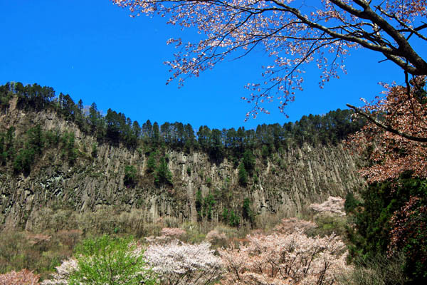 前日の風雨で桜も一部落花していたが、屏風を立てたように聳え立つ岩壁、真っ青な空と山桜が素晴らしく綺麗だった。