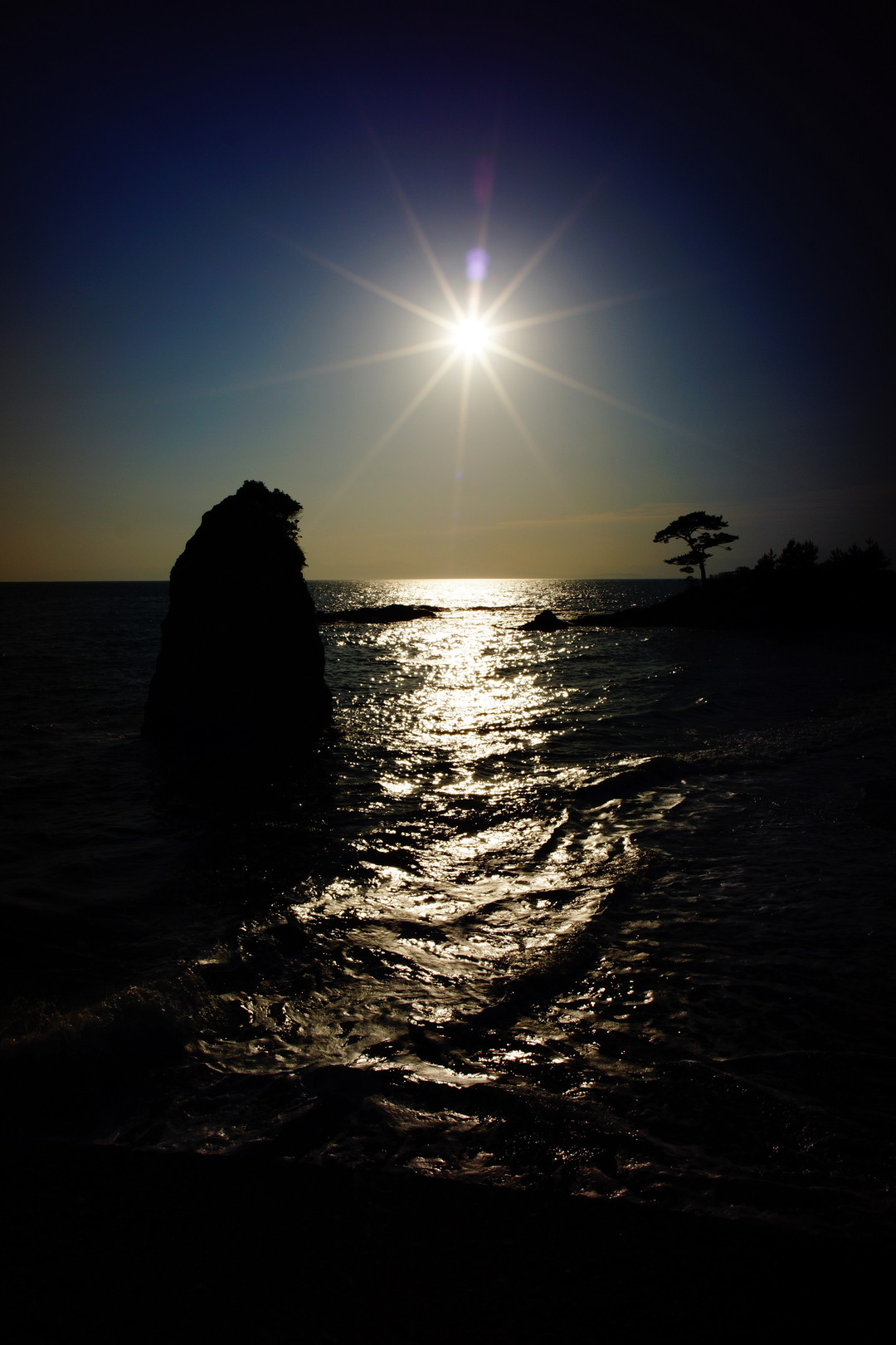 神奈川県葉山の立石 沈み行く太陽が作る1本の道。