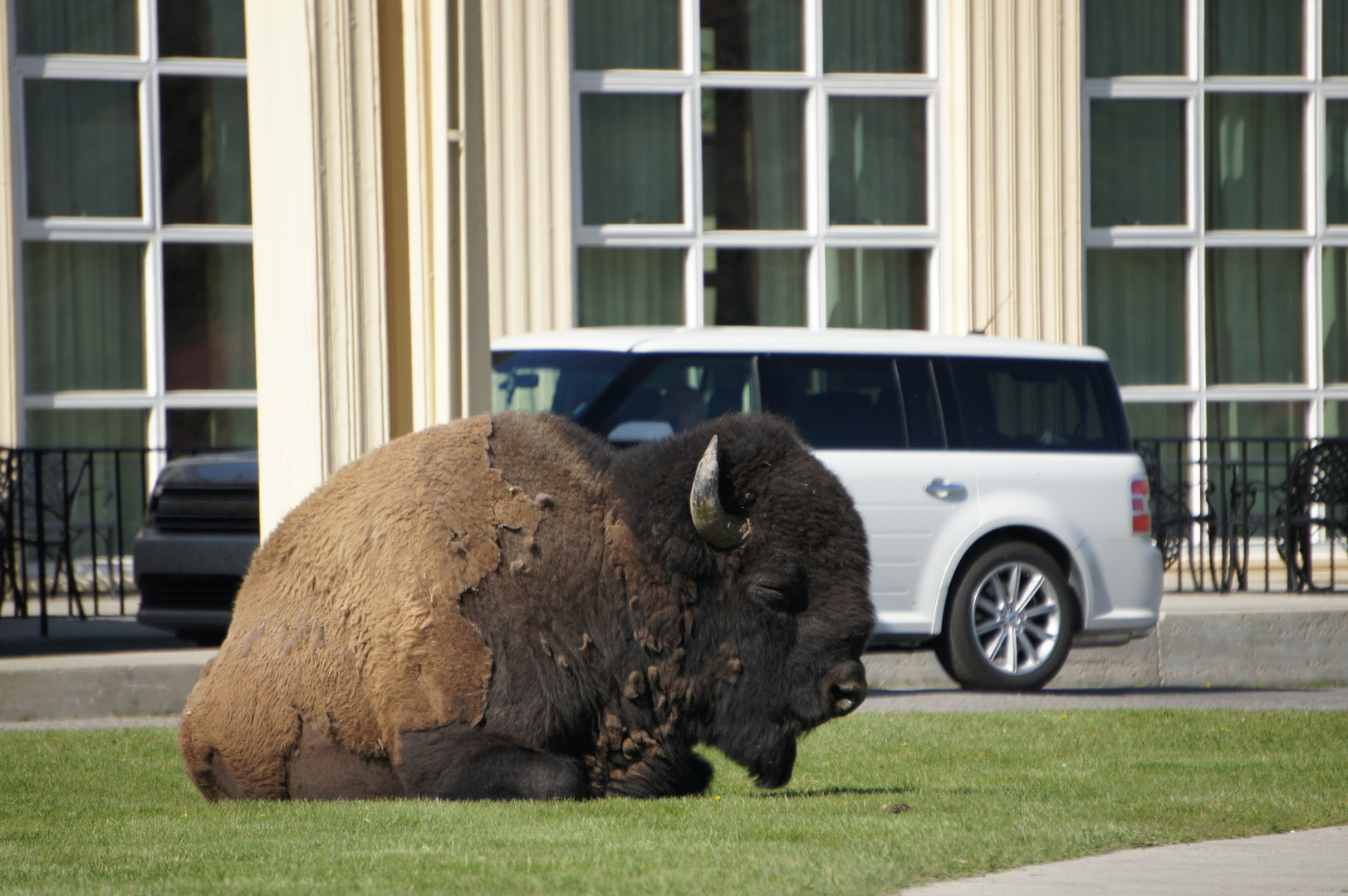 アメリカン・バファローがホテルの前で寝ていました。イエローストーンならではの光景です。