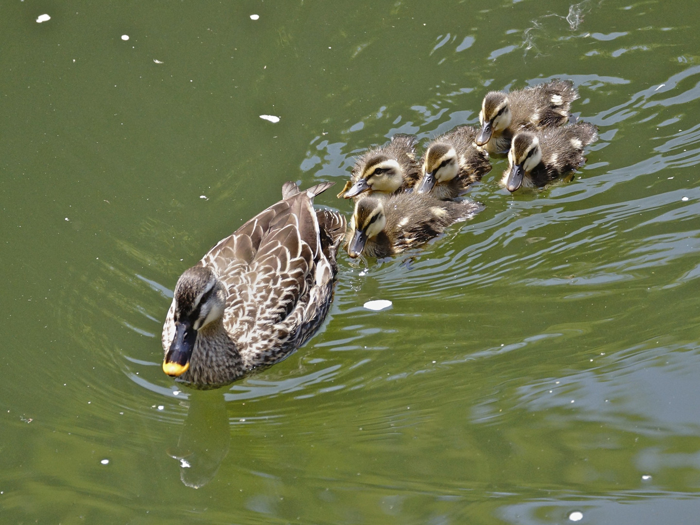 危険を感じたカルガモの移動。母親に遅れまいと5羽の子ガモたちも一生懸命について行きます。
