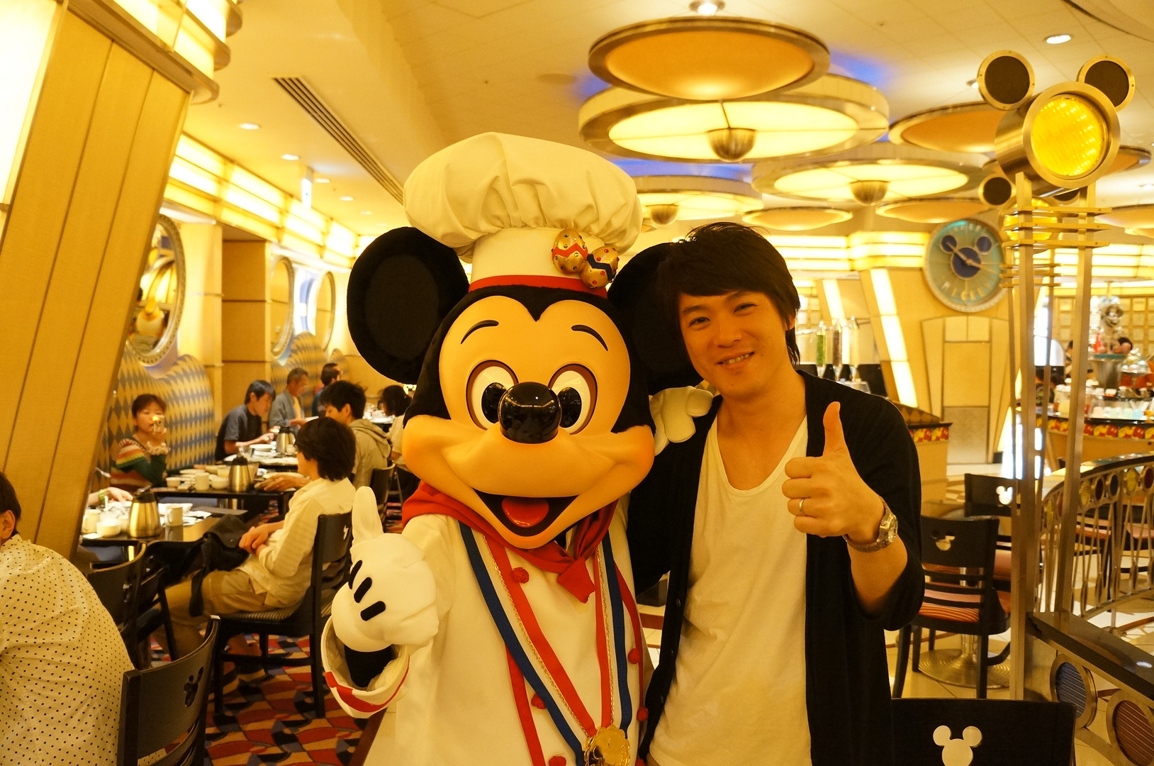 硬派な私がついにはミッキーと2ショット。 アンバサダーホテルのシェフミッキーにて。 キャラクターがサービスに回ってきてくれる超人気店です。料理も充実!