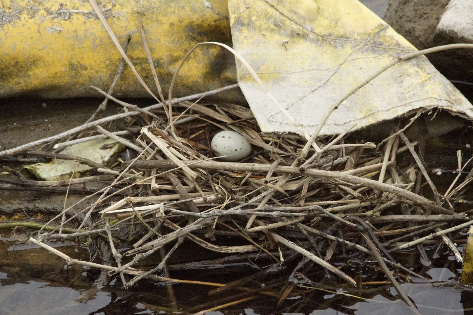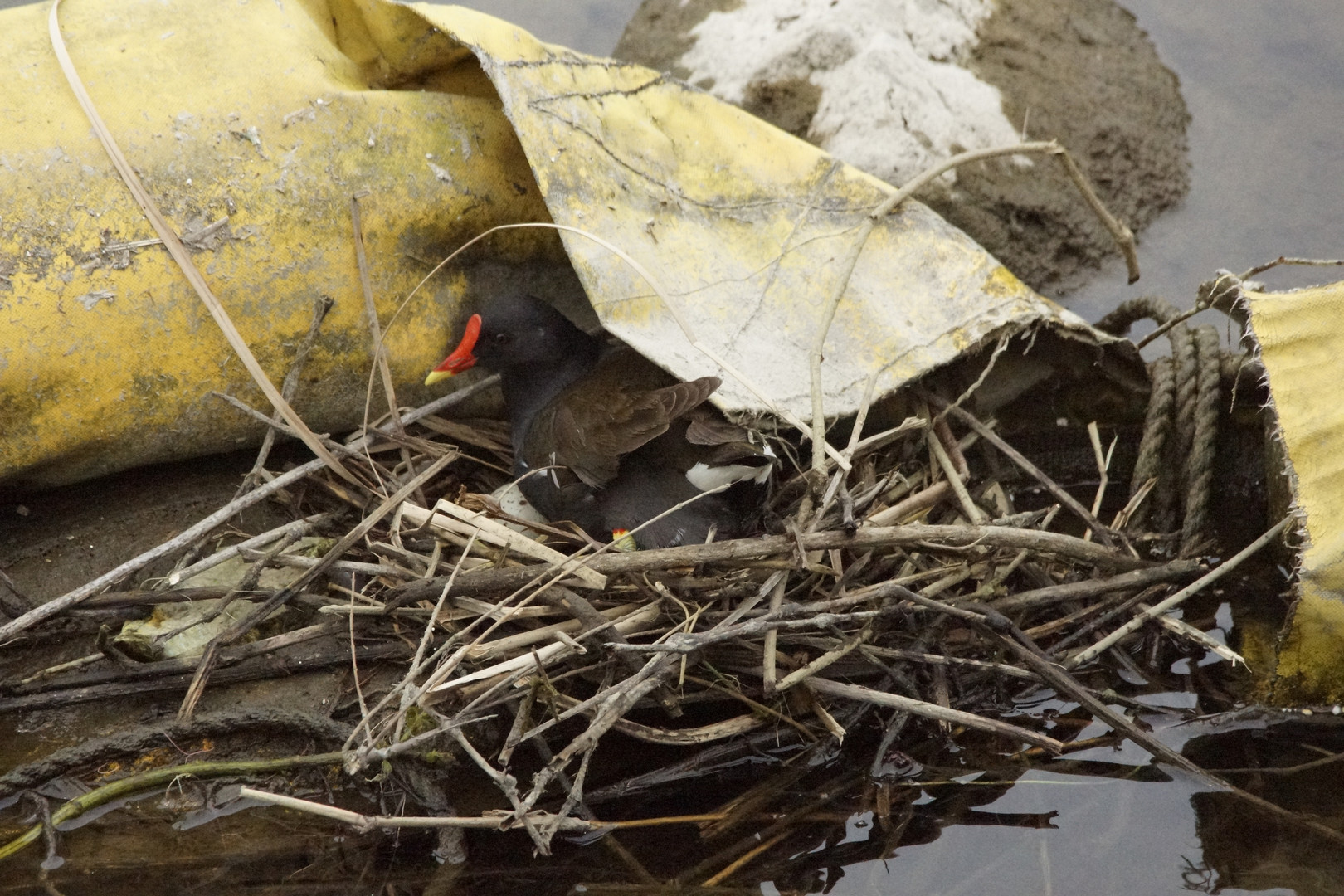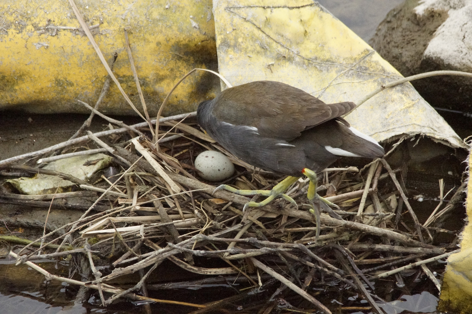 バンのつがいが、居ると 思っていたら 卵を抱いていました、横の黄色い物体は上流から流れて来た オイルフェンスなのですが、上手く利用して巣を作って居ます