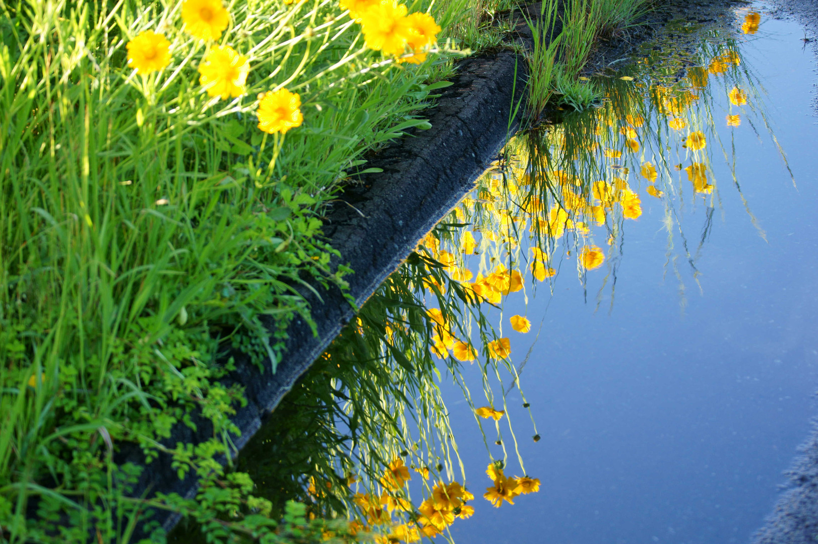道路に出来た水溜りに青空と花が写り込んでいました。