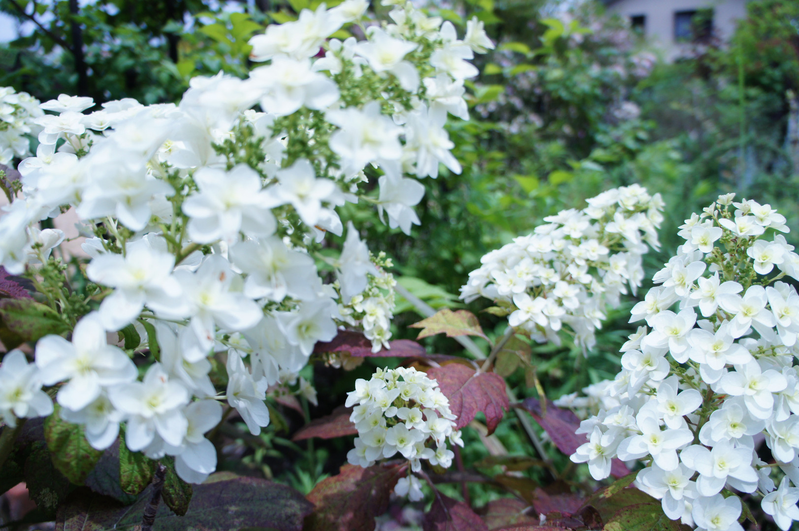 まんなかのちっちゃいこに ピント合わせてみました 柏葉紫陽花(八重咲)です