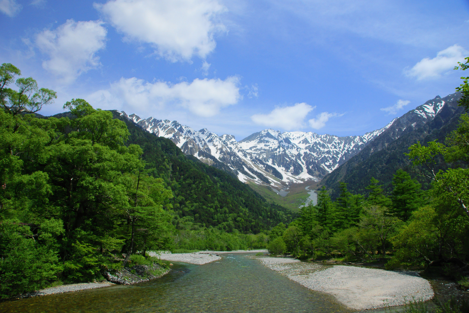 新緑の季節に上高地に行って来ました。 天候に恵まれて、新緑と残雪の穂高連峰が綺麗に見えました。