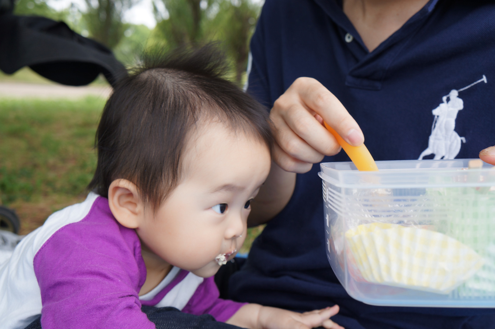 自分のお弁当は食べ終わったのに、パパのお弁当を狙う息子です。しっかり確認しています。