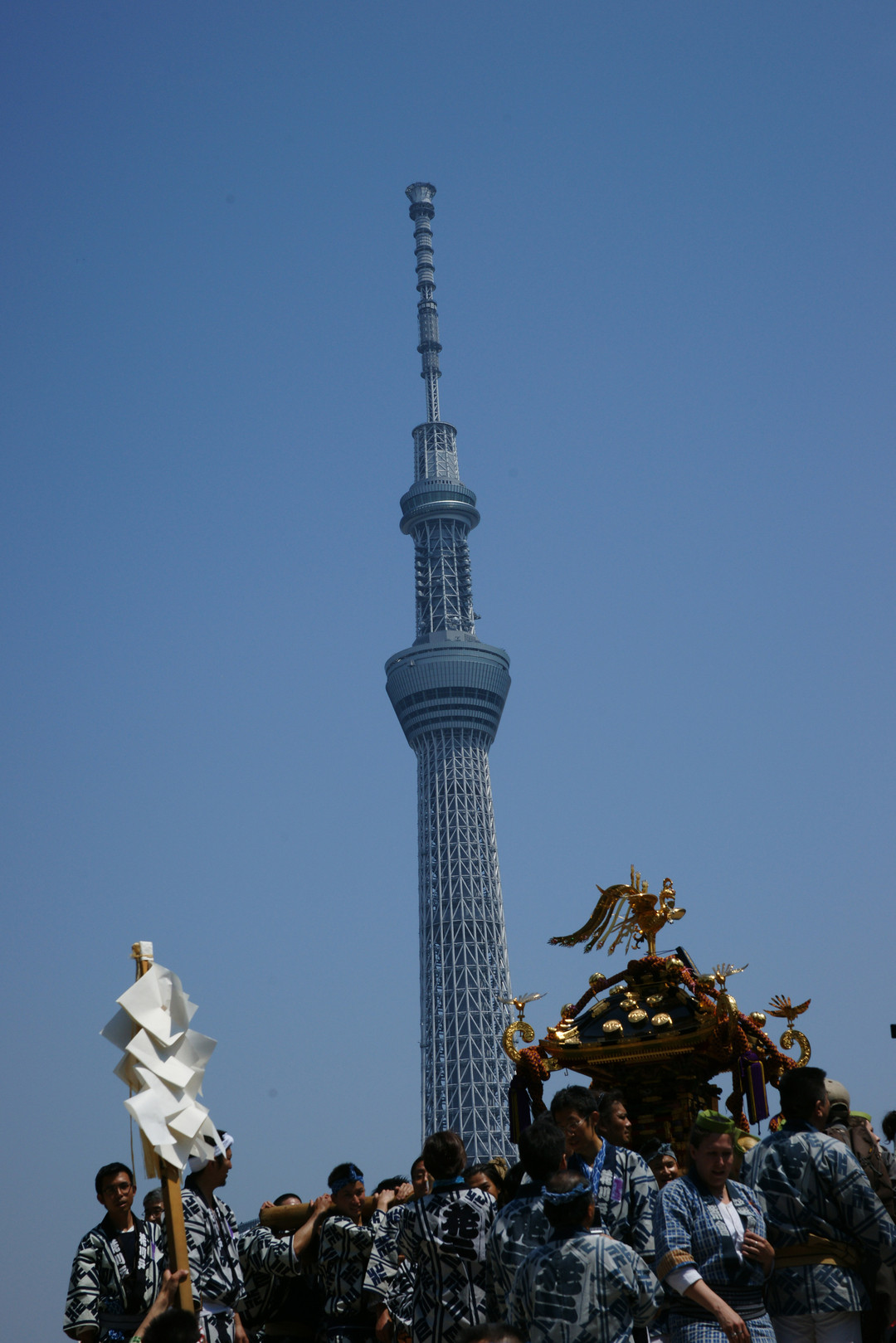 好天に恵まれた三社祭の一駒です。 浅草寺裏手に集まった神輿が各町内に練って行く一基を追っかけたところ隅田公園の土手に登り開業まじかの東京スカイツリーとご対面でした。 今年初めてのシーンですね。