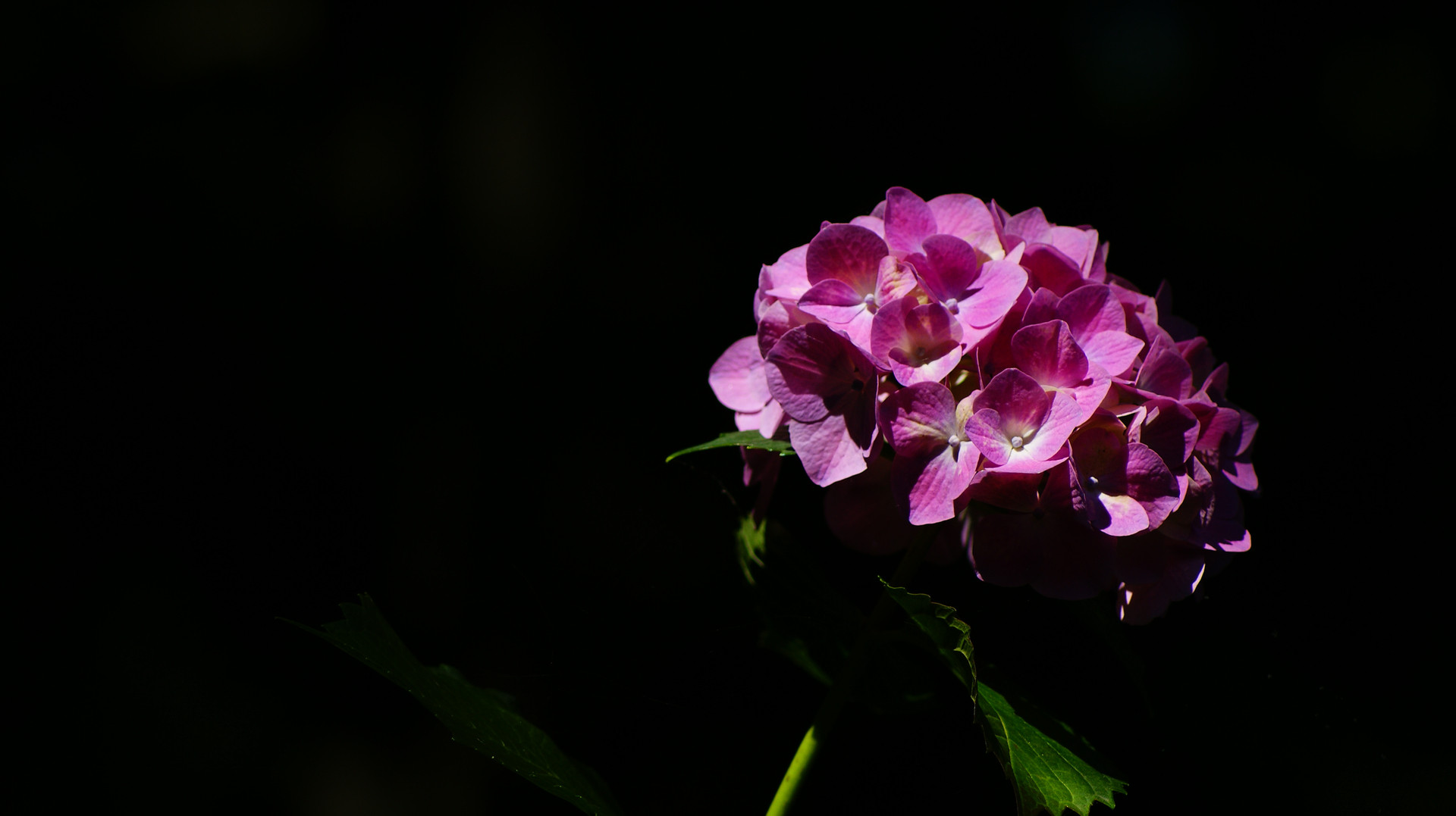 木々の隙間から自然のスポットライトが紫陽花を照らしていました。
