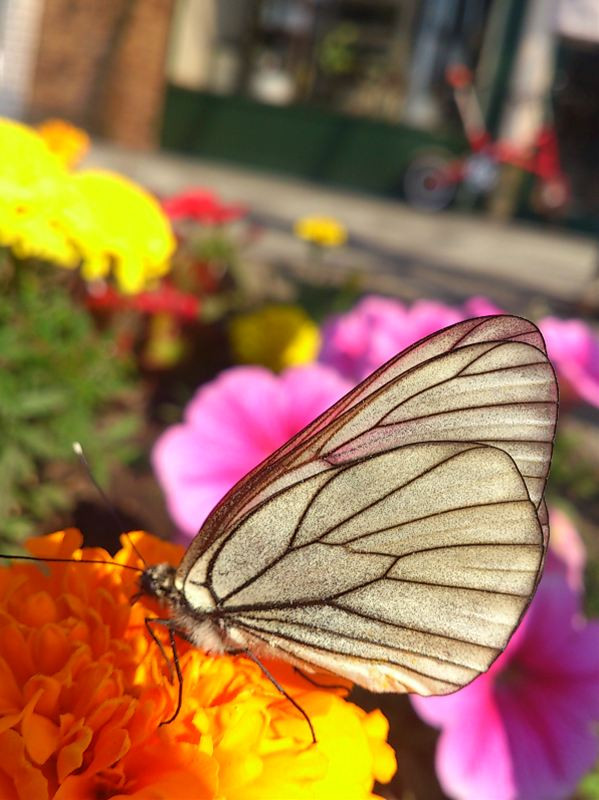 職場の前の花壇に植えたお花に蝶々がゆったりまったりしてます