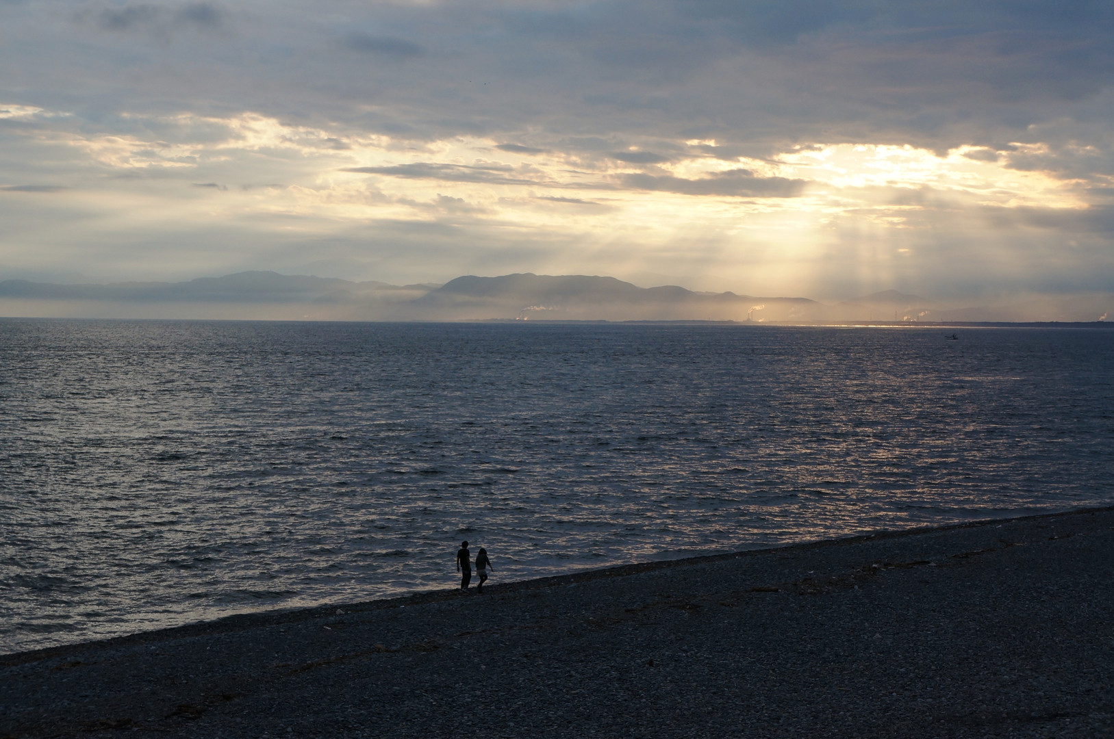 カメラを持って海へ。 雲間から夕陽が差す、天使の梯子が撮れました。 光がくっきり写ってなんだか不思議な感じの写真に・・ 手前のカップルも良い雰囲気です。