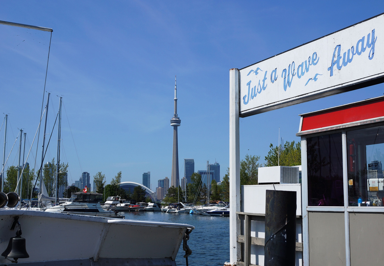 よく晴れた休日の午後。トロントニアンの憩いの場所、トロントアイランドから・・・・ ロジャースセンター(開閉ドーム式野球場)の屋根が空いているのがわかります。