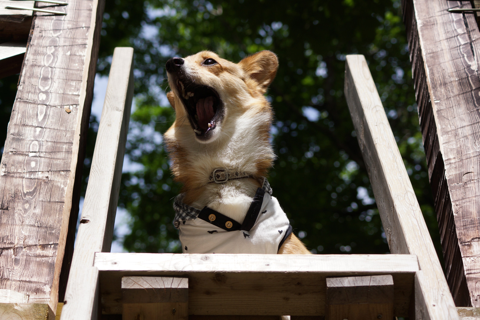 ツリーハウスに乗せられた愛犬そうの表情です。