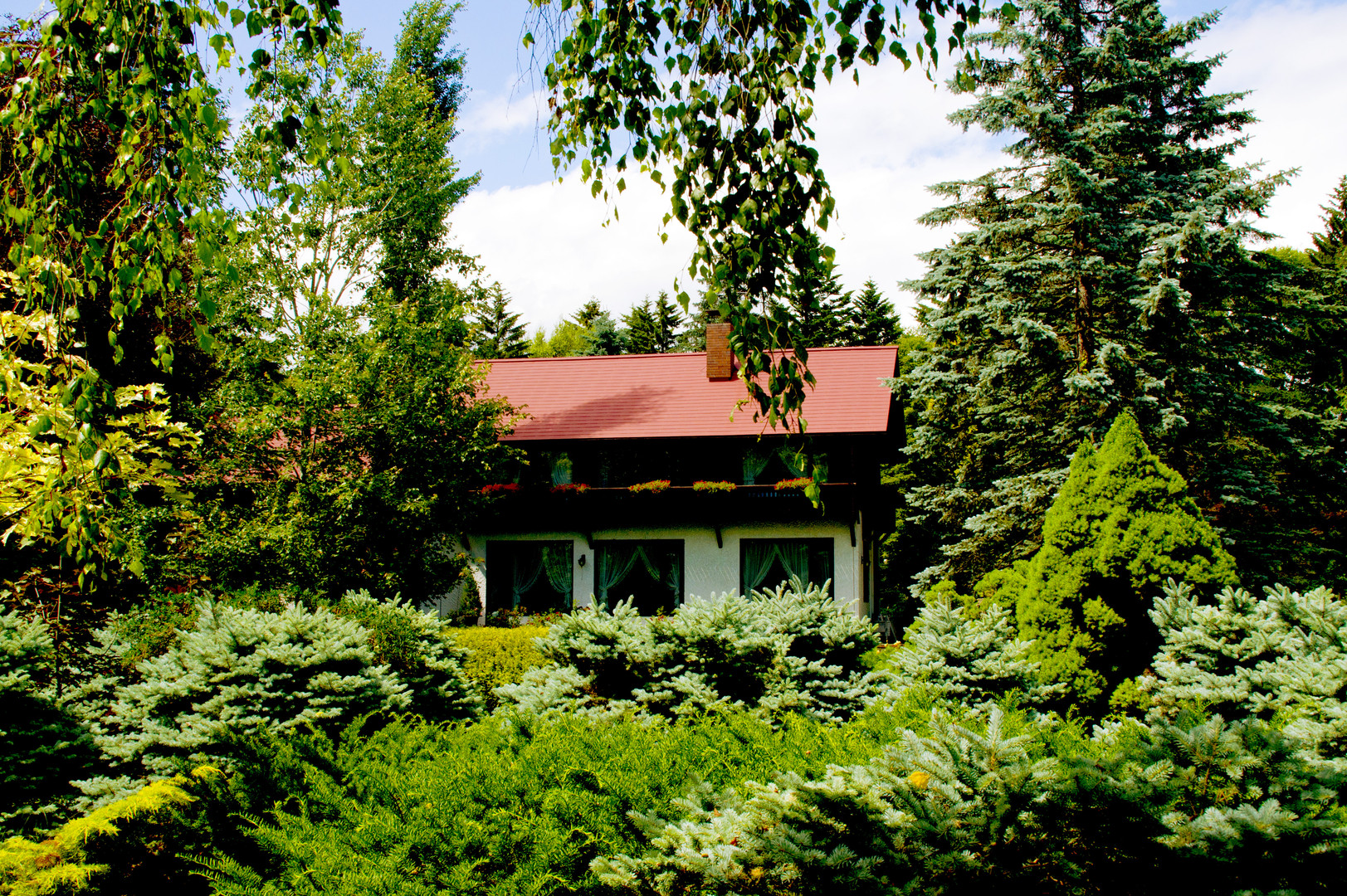 帯広市の真鍋庭園内での一コマ。ヨーロッパ式庭園のたくさんの樹木に囲まれてポツンと赤い屋根の家がありました。まるでおとぎの国のようです。