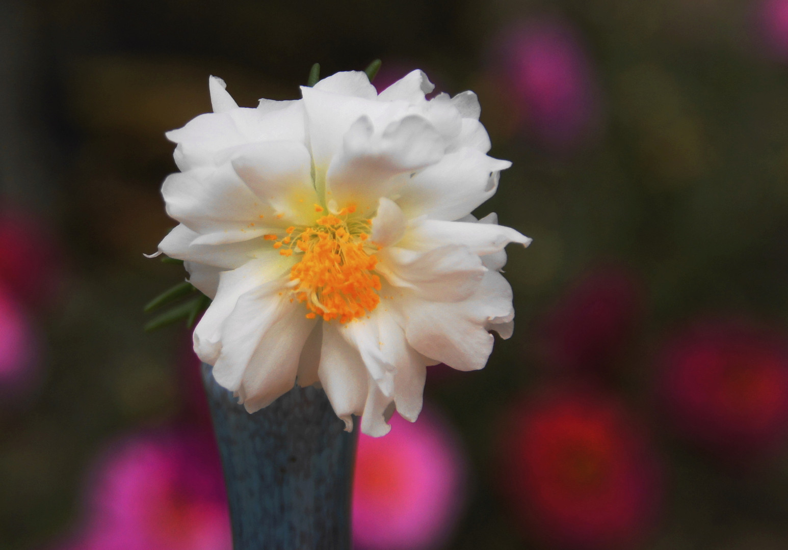 種から蒔いた白い松葉ボタン、バックにピンク、オレンジの松葉ボタンを配してみました。