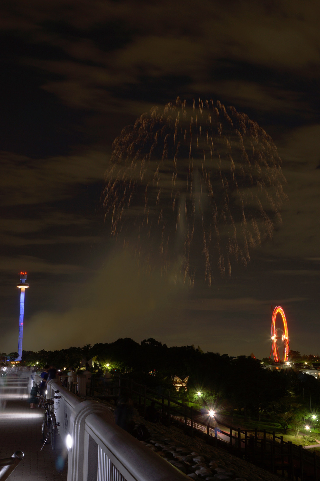 西武園遊園地のジャイロタワーと大観覧車の間に花火は上がります。最後の花火の残影です。
