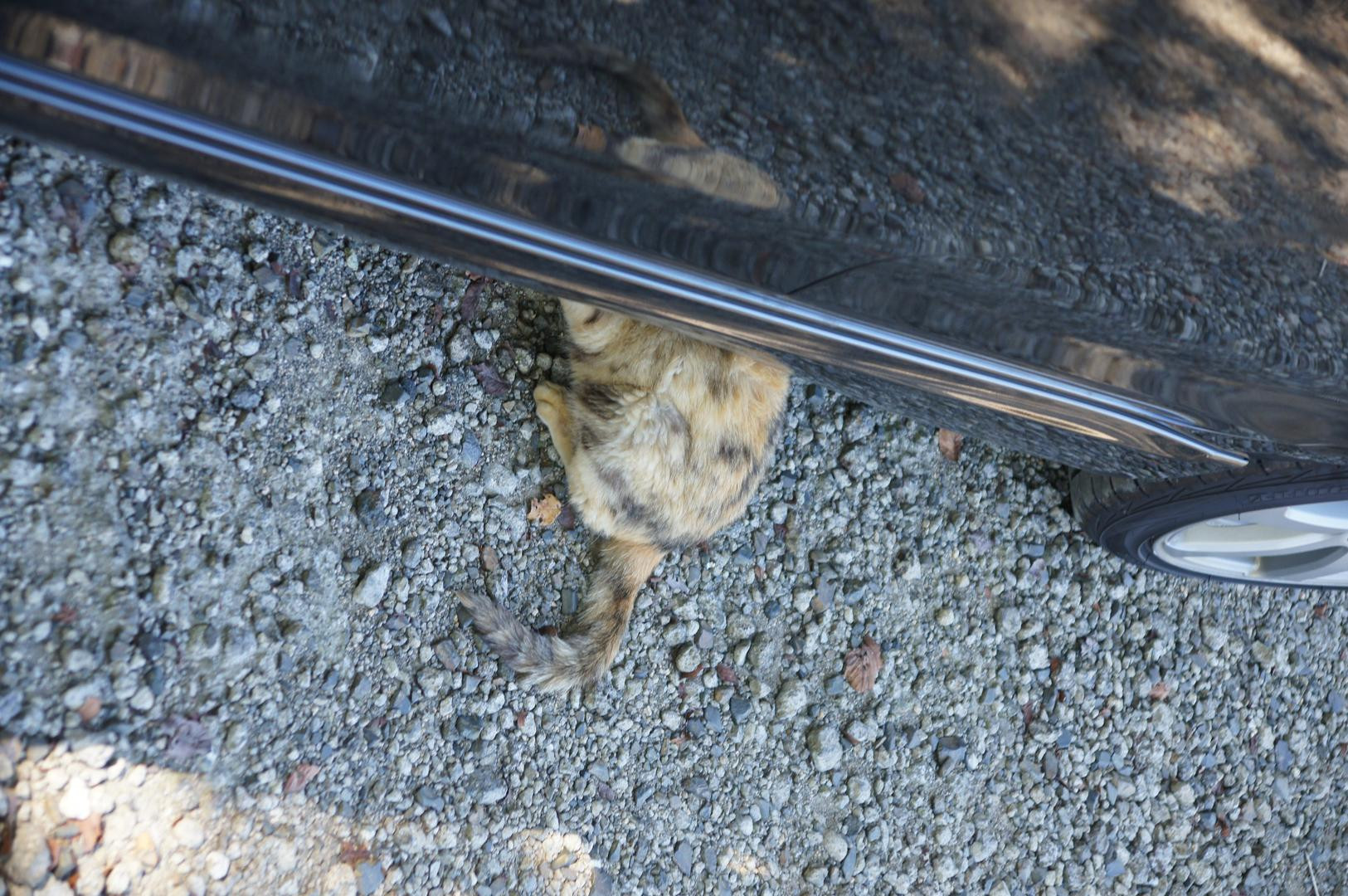 車の下に隠れてるつもり。