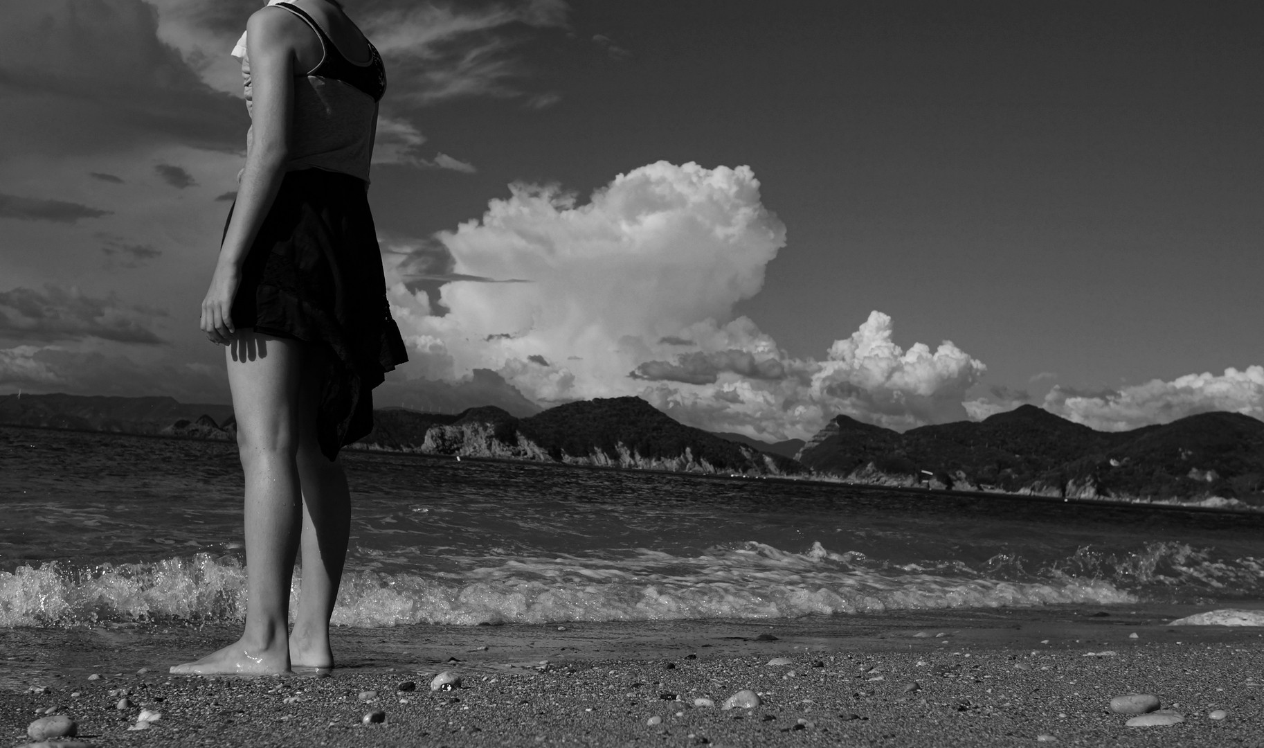 海を見つめるいとこの小学生。足だけしか浸かれないことに不満なようでした。