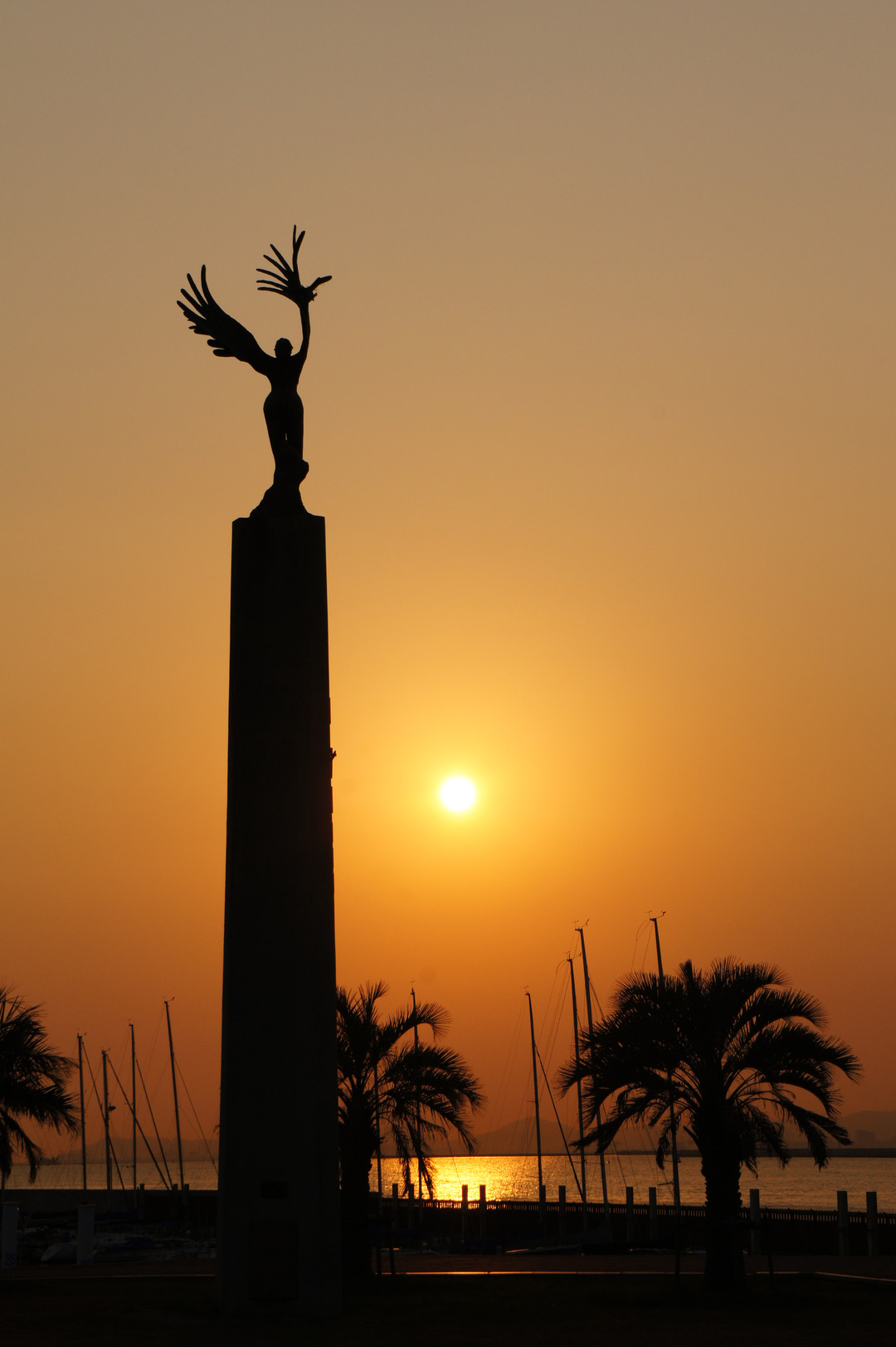 大阪の西の端に「北港ヨットハーバー」があります。そこに建っているモニュメントと夕陽。