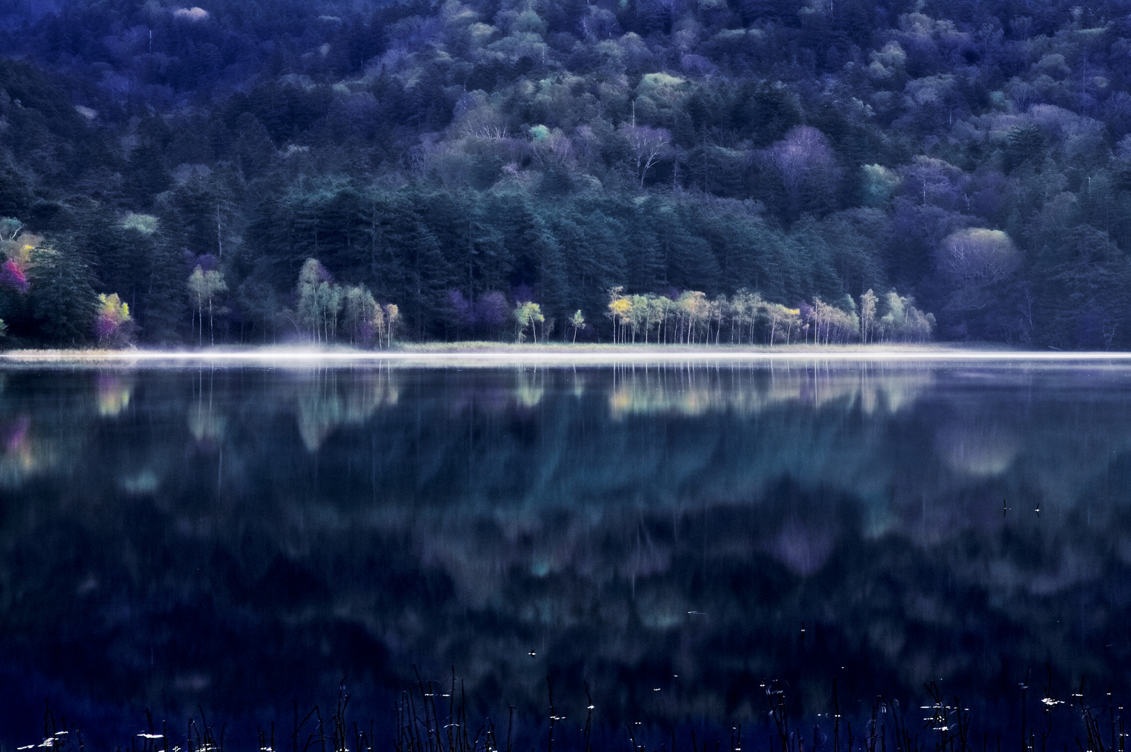 3枚の画像を比較明合成し、湖面の朝靄を強調。 SILKYPIXで映り込みをクッキリと仕上げました。
