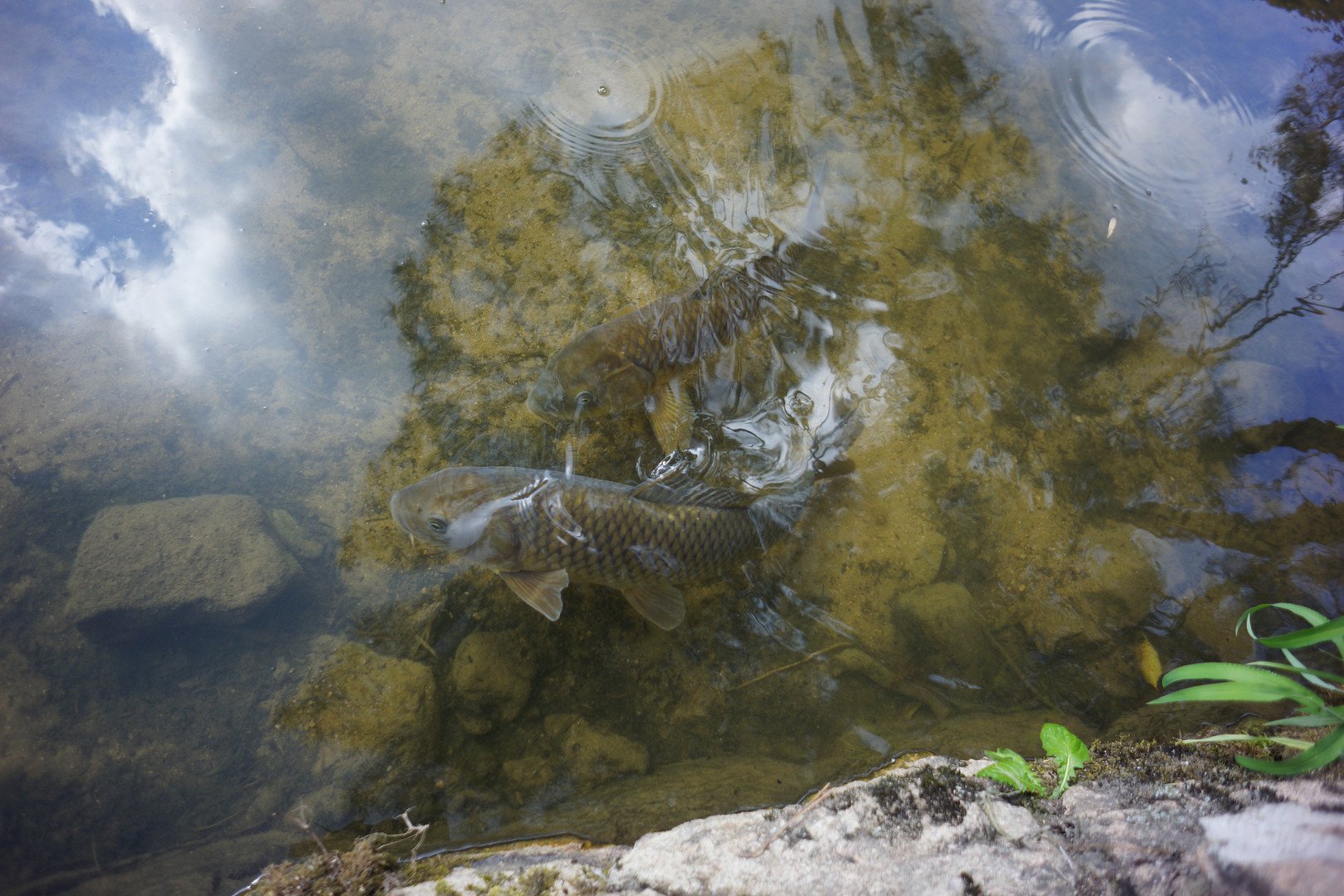 青空の映った川?堀?の中で気持ちよさそうに泳いでいたコイ君たち。