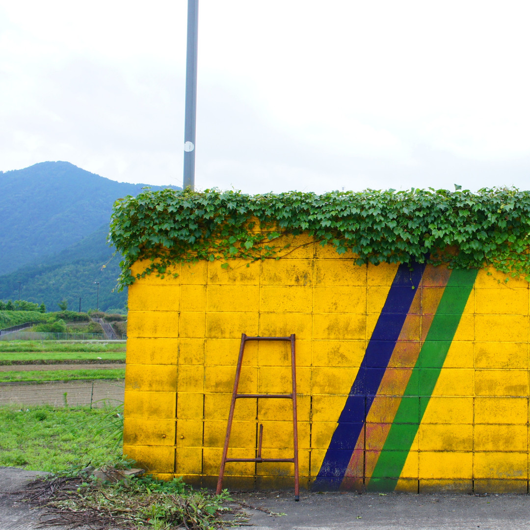 <兵庫県丹波市> ガソリンスタンド跡地の塀に…はしご? その先に見えるのはただの田んぼか、はたまた…ただの畑か。